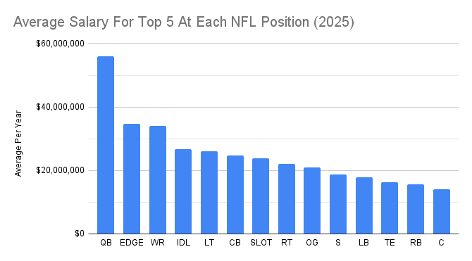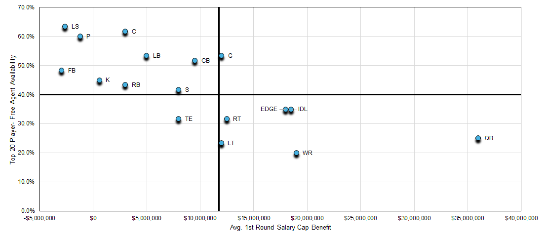 The last part of this calculation is the supply of each position because not every player actually becomes available each offseason thanks to re-signing players and the franchise tag. The chart below outlines this beautifully. Not only do QBs, WRs, LTs, RTs, DTs, and EDGEs make the most money, they are also the positions that do not become available to sign if you're a team looking for those positions. This explains how mid-level LT Dan Moore signed an $82M/4yr contract this offseason compared to Super Bowl winning above-average S Justin Reid's $31M/3yr contract. The Titans, Patriots, and other teams wanted to protect their young franchise QBs by signing a LT, and Moore was the only one available on the market, so the bidding spins out of control. That's supply and demand in a free market, baby.