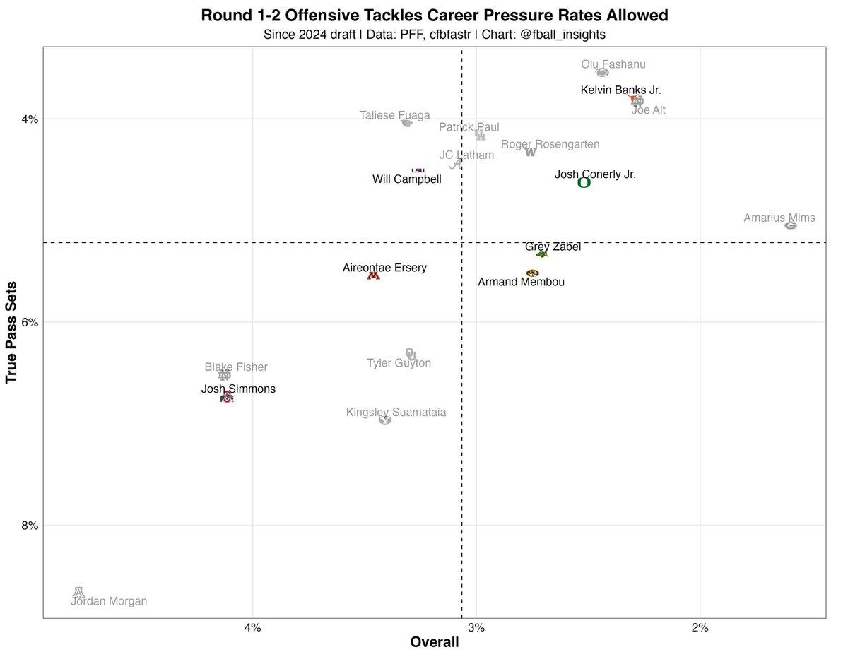 The 21-year-old early declare is a 6’5”, 315-pound left tackle with three years of starting experience in a friendly-built Steve Sarkisian offense. Banks is a very good athlete, excelling as a run-game puller and in the screen game. He's strong enough to hold up against bull rushes and he has 90th-percentile wings with 33.5-inch arms to keep edge rushers off his chest. That's when his hands are firing on time, which can explain a chunk of his negative plays. It's fair to say he needs more technical development. That said, he showed impressive pass protection reps against star DT Mason Graham, handling power and quickness well. In a zone based scheme, Banks is an asset in the ground game because he travels well to the second level (32-inch vert is the 88th percentile), but he's not a total mauler on down blocks right now. He looks like an ascending, above-average left tackle in a zone based scheme with the recovery skills of being a quick-footed guard as a backup plan. Those are very hard to find and are very valuable. He's a high character person by all reporting, too. Banks has the traits to be a stud guard as a backup plan.