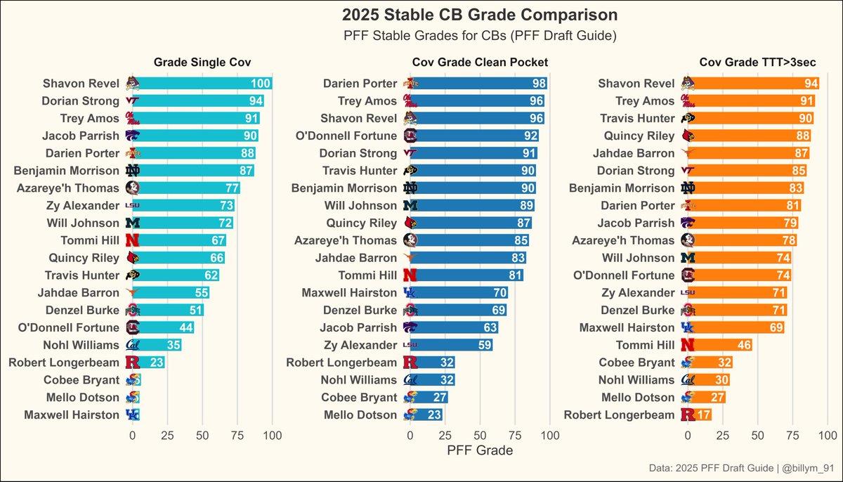 The 23-year-old is a 6'2", 194-pound corner with great size and length (80-inch wingspan), and the closing speed to be a high-end outside corner. He flashed athleticism against Michigan in 2023 with a downfield pass deflection in zone and multiple behind the line of scrimmage tackles against the run. Revel also had a nasty Pick 6 on a flea flicker in another contest. There are highlights here, but it's not a straight forward projection, as he played well below-average competition, had just 68 career man coverage snaps, and is coming off a torn ACL. He looked like an excellent athlete capable of mirroring in man coverage and we know he was a great zone player before his injury, but it's a scary injury at this position.