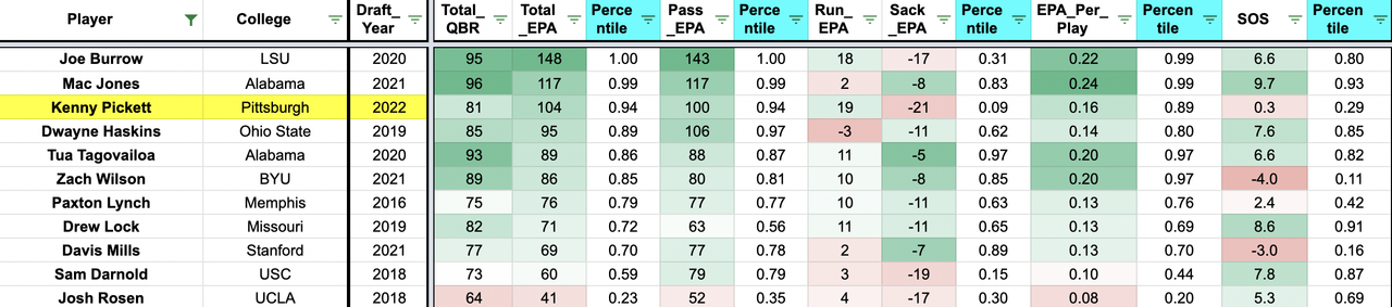 Pickett (6’3/217) was a 3-star recruit and a 4-year starter at Pitt, who was completely off the 1st-round radar until his redshirt senior season when he had 47 total touchdowns to 13 total turnovers. His 2021 total EPA is in the 94th percentile among drafted QBs since 2005, but he will be 23.8 years old on draft night and only faced a 29th percentile strength of schedule.