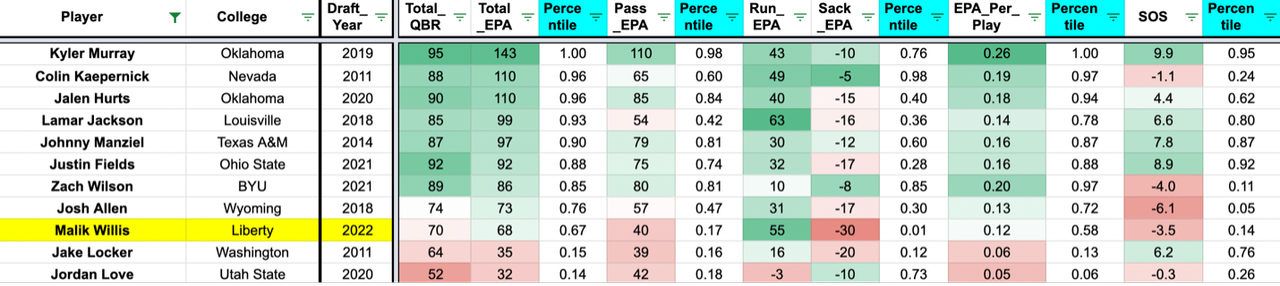 That’s very impressive because Willis’ sack totals are completely off the charts. His -30 EPA lost on sacks is 2nd worst out of 196 drafted QB prospects since 2005, only trailing Mike White. The primary reason for this is his current poor anticipation. Willis only occasionally makes it though a full-field read and too often looks the wrong way directly after the ball is snapped. Smarter defenses began dropping eight or nine defenders and played zone, a strategy that has been effective against other dual-threat QBs and very much worked against Willis – he was 105th out of 109 college QBs in points earned per play against four or fewer pass rushers. These are serious concerns and in total led to a 67th percentile total EPA against a 14th percentile strength of schedule. For this reason, Willis likely needs a full redshirt year in the NFL and could struggle for most of his rookie contract.