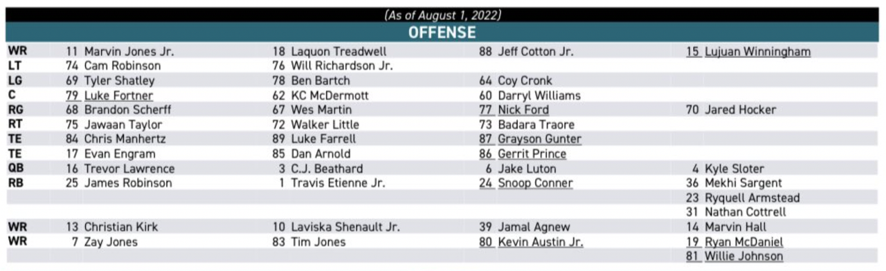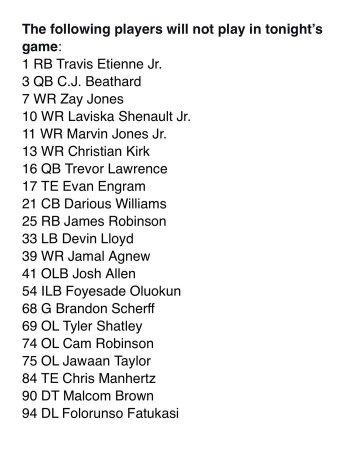 QB Trevor Lawrence (rest) - OUT, QB C.J. Beathard (groin) - OUT, RB James Robinson (Achilles) - OUT, RB Travis Etienne (illness) - OUT, WR Jamal Agnew (hip) - OUT, RT Jawaan Taylor (hamstring) - OUT, LB Devin Lloyd (hamstring) - OUT