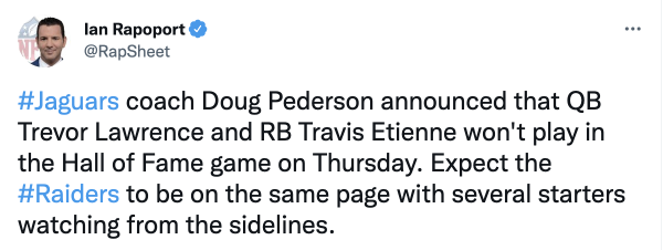"The fact that the Raiders also play the Jaguars in the regular season in Week 9 on Nov. 6 won’t affect the game planning in the epic quarterback matchup between backups Jarrett Stidham and Jake Luton. (We’re assuming that Stidham plays for the Raiders, as his competition with Nick Mullens for the No. 2 job behind Carr seems like a mere formality.)"