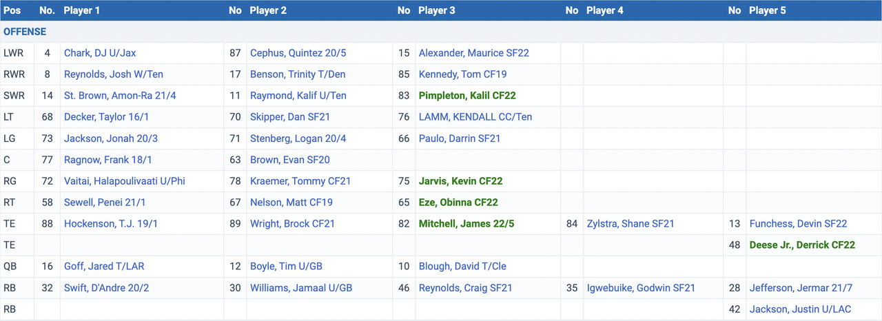 OUT: QB Jared Goff (rest), RB Greg Bell (hamstring), WR Jameson Williams (knee), DE Romeo Okwara (Achilles), DE Josh Pascal (hernia); QUESTIONABLE: WR Quintez Cephus (leg), TE Devin Funchess (groin)