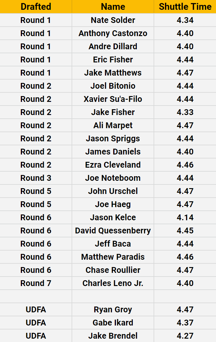 It is not a leap to say that if an offensive lineman at this year’s Combine hits that 4.47 short shuttle, he should be a target player. This type of success is extremely impressive. Again, that result places them in the top percentiles of their position, but it also results in success.