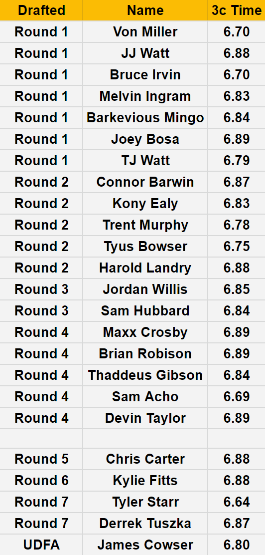 Below are the top 3-cone times for EDGE and DL that were drafted in the fourth round or earlier since 2007.