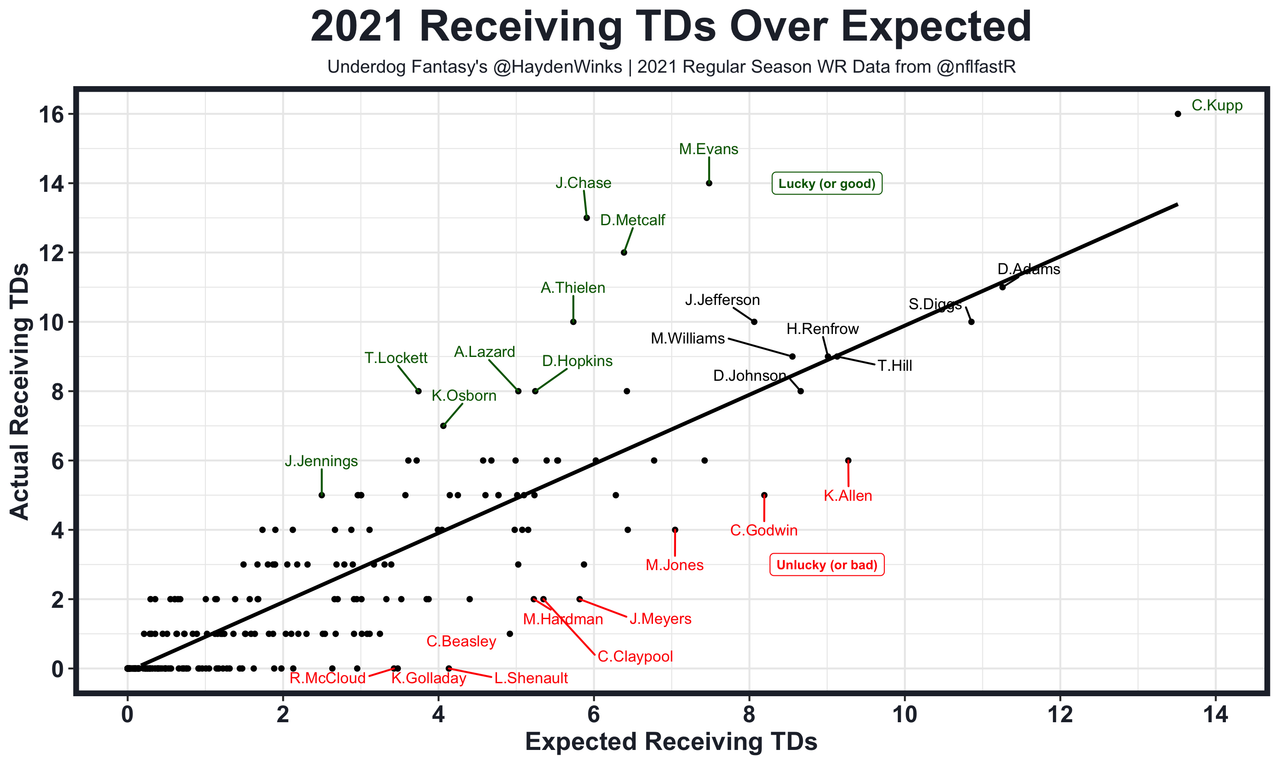 Kupp isn't as big of a negative regression candidate as most think. He was expected to score 13.5 touchdowns based on his usage last year, so as long as his usage stays in a similar spot next season, then he should remain in the double digit zone. In other words, his baseline for touchdowns is just off the charts good right now because of the Rams' offense and his own play. If I had to pick who will score more touchdowns between Kupp and Chase next year, give me Kupp. His touchdown scoring was less outliery.