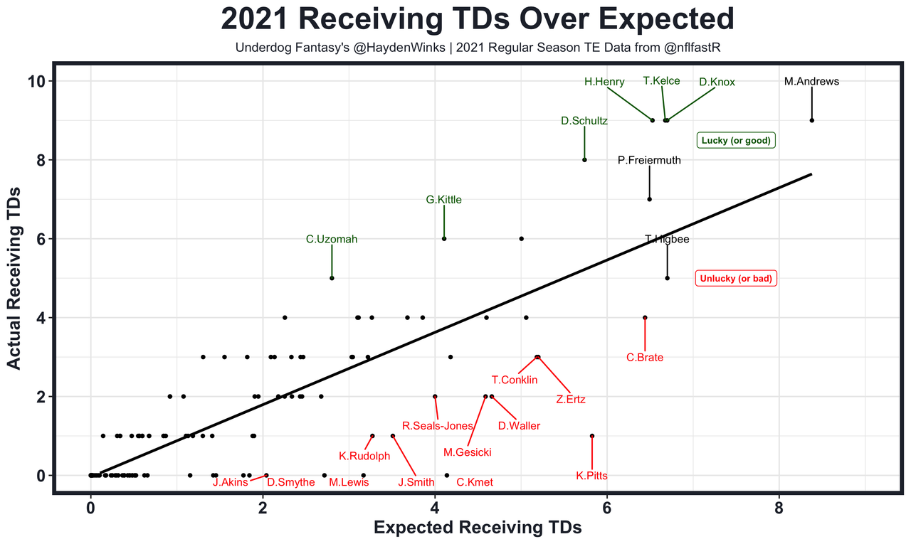 This is the one that everyone will cite this entire offseason. Pitts, put simply, was the unluckiest fantasy tight end or fantasy receiver this year. He converted just one of his 14 red zone targets into scores despite lighting up fools between the twenties. There is nothing about his game that makes him worse in the red zone. In fact, he's going to settle in as a player who overperforms my model because he's a beast. His 2022 touchdown projection is in the 6-8 range with Atlanta likely playing better offense next year.