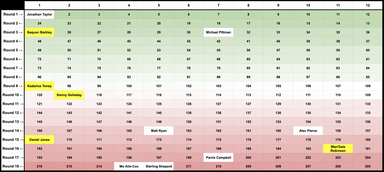 Favorite game stack: Saquon Barkley (Round 2) + Kadarius Toney (Round 9) + Daniel Jones (Round 15) with Michael Pittman (Round 3) and/or Nyheim Hines (Round 12) and/or Alec Pierce (Round 14).