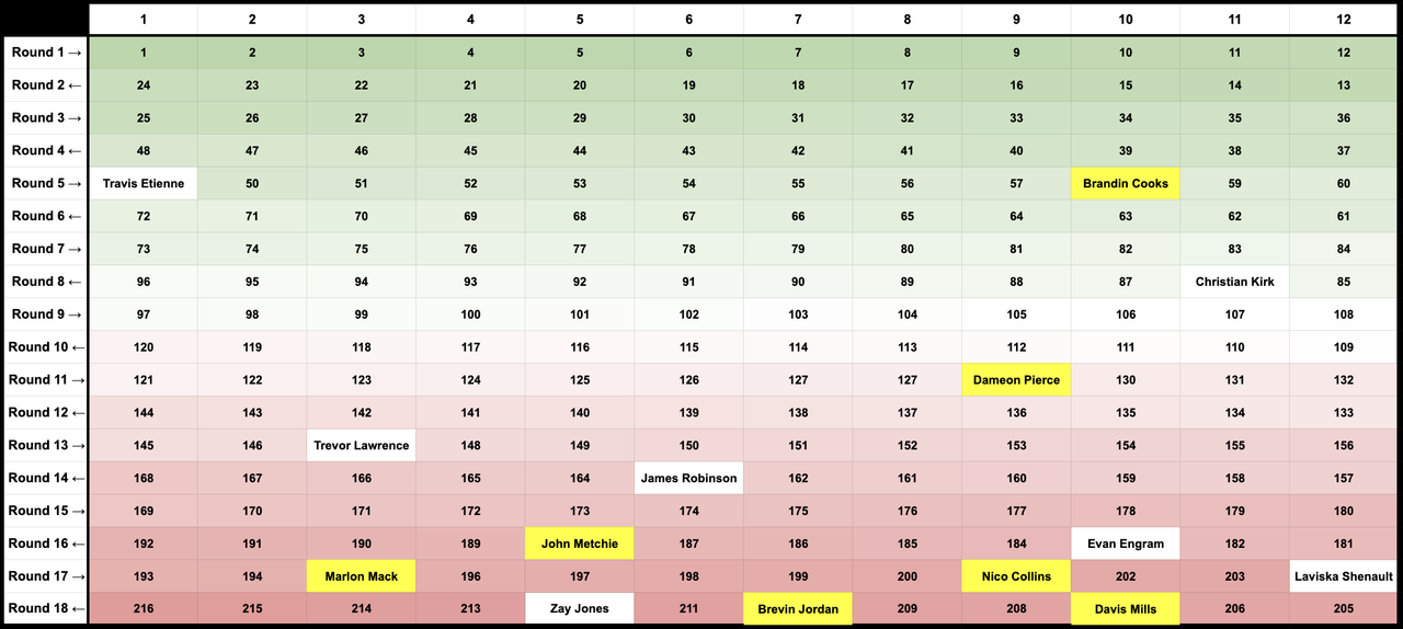 Favorite game stack: Christian Kirk (Round 9) + Trevor Lawrence (Round 13) + Evan Engram (Round 16) with Brandin Cooks (Round 5) and/or Nico Collins (Round 17).