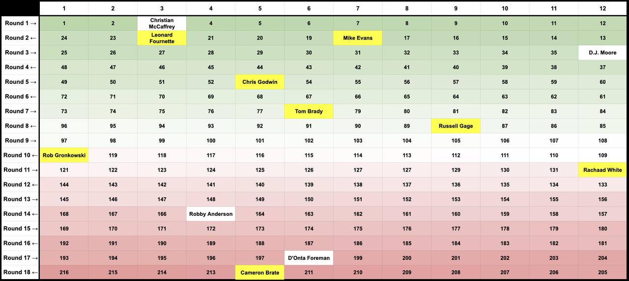 Favorite game stack: Mike Evans (Round 2) + Tom Brady (Round 7) + Russell Gage (Round 8) + Cameron Brate (Round 18) with Christian McCaffrey (Round 1) and/or Robby Anderson (Round 14/15 turn).