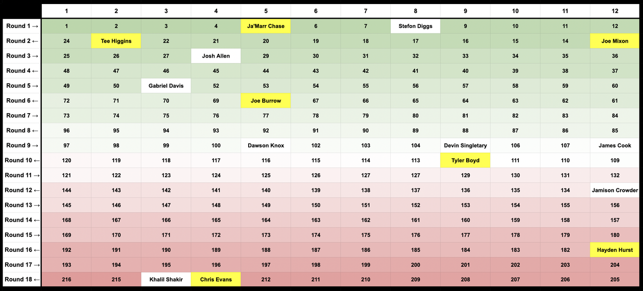 Favorite Game Stack: Josh Allen (Round 3) + Gabriel Davis (Round 5) + Dawson Knox (Round 9) with Tee Higgins (Round 2) and/or Tyler Boyd (Round 10) and/or Chris Evans (Round 18).
