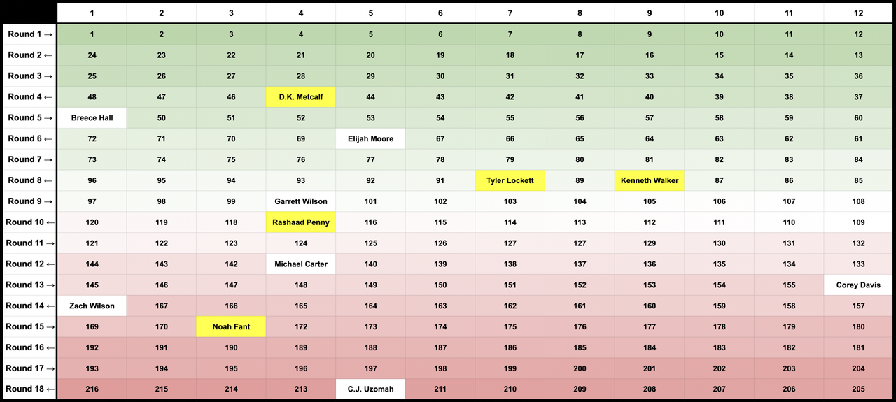 The Jets are a highly-debated team because the skill positions have plenty of young talent, but the offensive structure can be hit-and-miss for fantasy football and Zach Wilson (Round 14/15 turn) was one of the very worst quarterbacks to make an NFL start last year. For that reason, he is cheap and a backdoor stacking candidate if you have much faith in his talent (I'm nervous). Elijah Moore, who is a stud, goes in Round 6 but will have to hold off Garrett Wilson (Round 9) and Corey Davis (Round 13/14 turn) to start in 2-WR sets. We'll learn more in training camp about where the value is here, but they go in their own pockets of the draft, so it's an easy-to-stack offense. ... The obvious bring back on Jets stacks is DK Metcalf (Round 4) who goes just before Breece Hall (Round 5) if you're looking for mini correlation. Tyler Lockett (Round 9), Kenneth Walker (Round 9), and Rashaad Penny (Round 10) are the other high-upside Seahawks and don't interfere with Jets' stacks on the draft board. Round 15 Noah Fant, an absolute dog when given volume, is the last-minute bring back and fits the TE-less Jets' stack.
