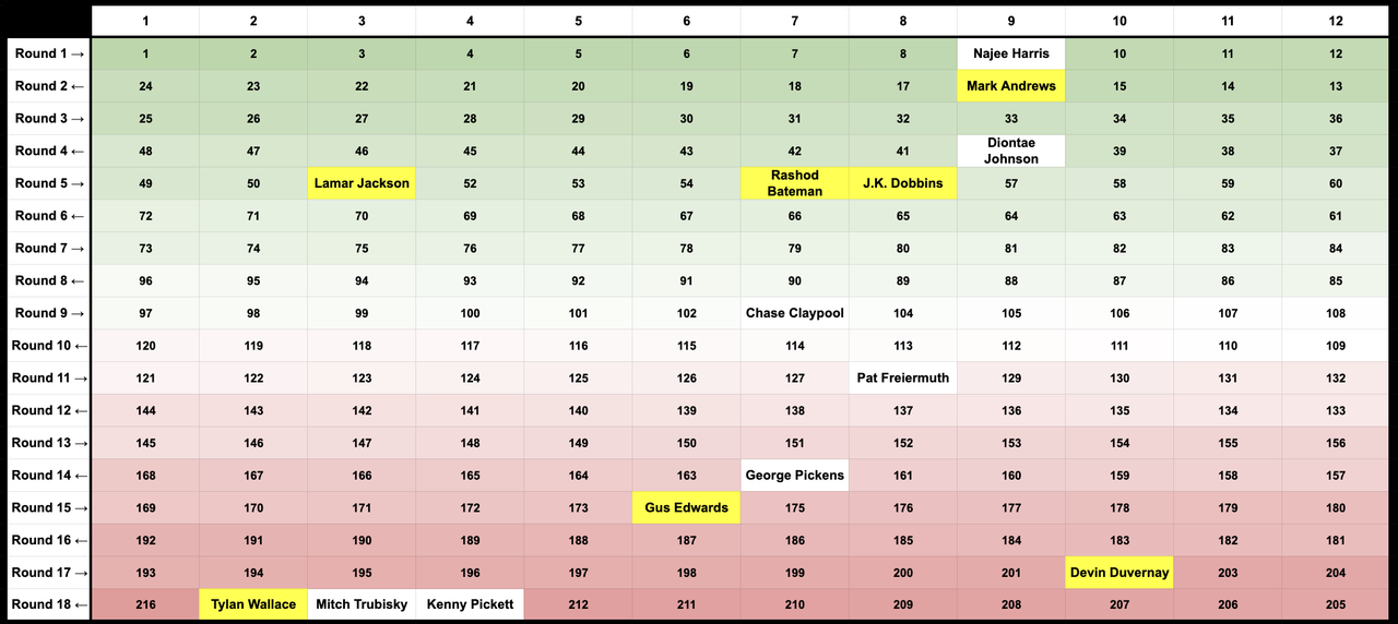 Favorite game stack: Lamar Jackson (Round 4) + Rashod Bateman (Round 5) with Chase Claypool (Round 9) and/or Pat Freiermuth (Round 11) and/or George Pickens (Round 14).