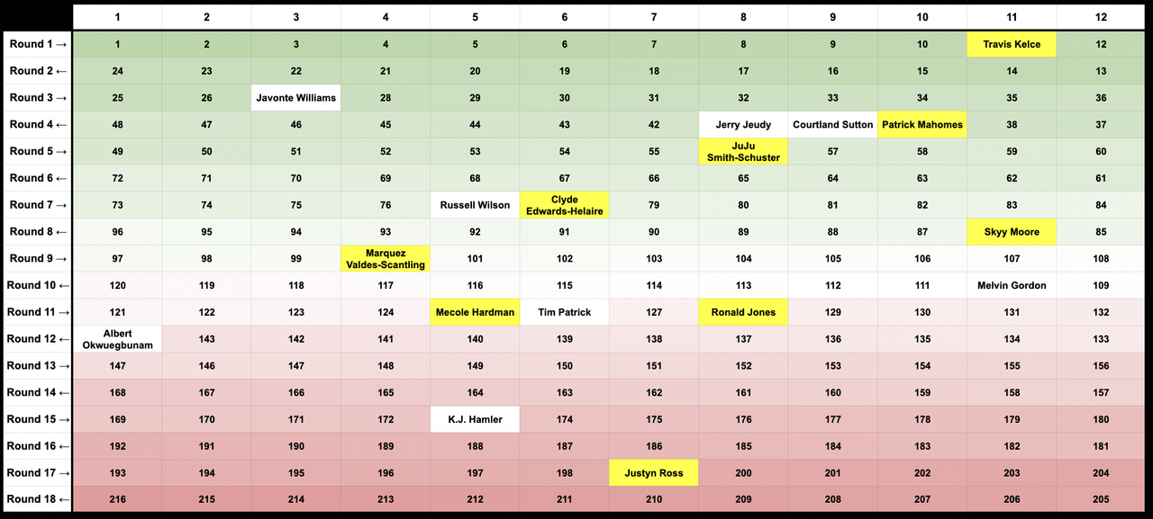 Favorite Game Stack: Patrick Mahomes (Round 4) + JuJu Smith-Schuster (Round 5) + Marquez Valdes-Scantling (Round 9) with Melvin Gordon (Round 10) and/or Tim Patrick (Round 11) and/or Albert Okwuegbunam (Round 13).