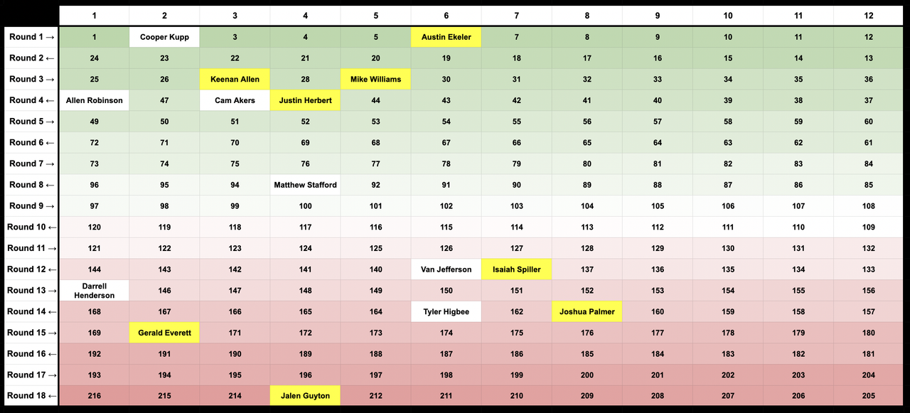 Favorite Game Stack: Cooper Kupp (Round 1) + Matthew Stafford (Round 8) + Tyler Higbee (Round 14) with Mike Williams (Round 3) + Gerald Everett (Round 15).