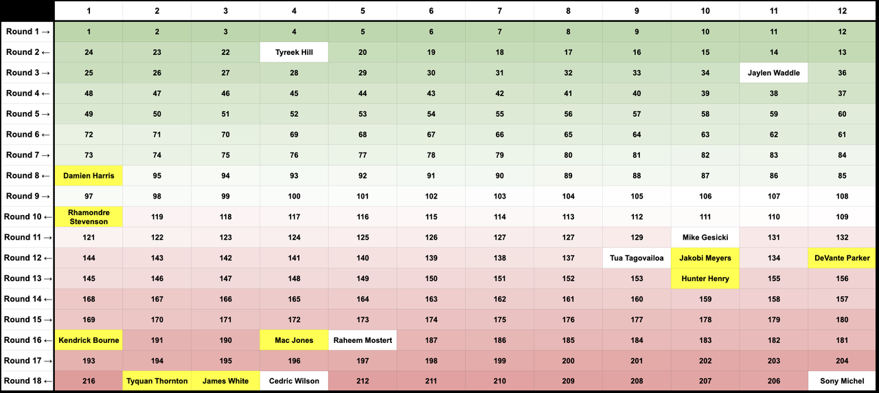 Favorite game stack: DeVante Parker (Round 12) + Hunter Henry (Round 13) + Mac Jones (Round 16) with Tyreek Hill (Round 3).