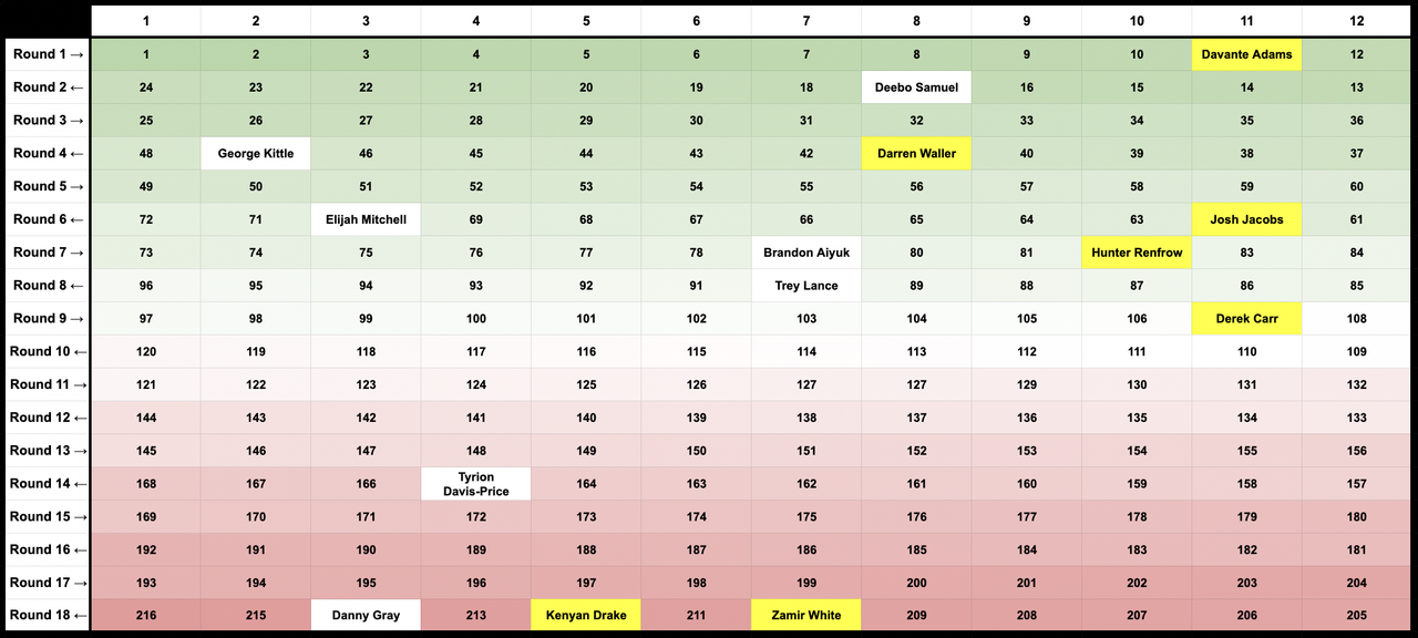 Favorite game stack: George Kittle (Round 4) + Trey Lance (Round 8) with Davante Adams (Round ½ turn) or Hunter Renfrow (Round 7).