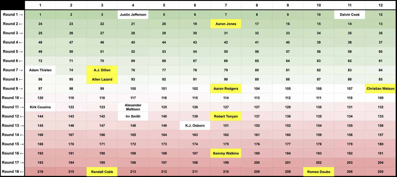 I know we’re not supposed to talk about projecting defenses in these best ball streets, but I project the Packers to be one of the best units in the NFL and the weather won’t help the Vikings here. With that said, man, there’s a lot of talent on the Vikings and they’re spaced out across the draft board: Justin Jefferson (Round 1), Adam Thielen (Round 6/7 turn), Kirk Cousins (Round 11), Irv Smith (Round 12/13 turn), and K.J. Osborn (Round 13). There’s not a great reason to draft Cousins without either Jefferson or Thielen, and because Thielen’s price has dropped, I think it’s rock solid to go with the ye’ old double stack. Adding Smith or particularly Osborn late is best when we only have one of Jefferson or Thielen, as their ceilings are unlocked when the other misses time. … Jefferson in Round 1 and Aaron Jones in Round 2 will be a very common pairing because their ADPs align perfectly, so avoiding that in favor of A.J. Dillon or some of the pass-catchers seems more unique and arguably straight-up better. Allen Lazard (Round 8) likely opens the year as the No. 1 receiver ahead of Christian Watson (Round 10), Sammy Watkins (Round 16), Romeo Doubs (Round 17), and Randall Cobb (Round 18), but watch out for a veteran like Julio Jones (Round 17) to enter the mix here. Whoever that veteran is would be smart to pair, as some of BBM3 teams have already been drafted without this pairing.