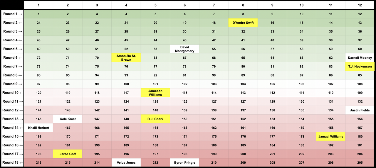 We get it, the Bears likely suck. But what if Justin Fields (Round 12) runs for a million yards and takes a slight step forward? Or what if the rest of the Bears’ pass-catchers are so painful that Darnell Mooney (Round 6) sees 150 targets this year? More importantly, they get a domed game against the damn Lions in Week 17. Mooney will be surrounded by Byron Pringle (Round 18), who goes undrafted frequently despite getting $4M this year to be a locked-in starter. Velus Jones (Round 18) has never been a target-getting receiver, but he’s free and will be in the Post-Bye Rookie Bump zone on New Year’s Day. I’m not a fan of Cole Kmet’s (Round 13) game to date, but they use him in the slot more than you might expect and Jimmy Graham’s red zone jump balls are a thing of the past. Because of their cheap prices and Kmet’s tight end eligibility, this offense can be double stacked with Fields very easily. … Just after Mooney goes off the board is when Amon-Ra St. Brown (Round 6/7 turn) goes, and T.J. Hockenson also is a bring back option in Round 8. Neither are my favorite values in general, and Jameson Williams (Round 10) could tank a bit with news coming out that he probably won’t be ready to start the season. Williams will be pretty, pretty interesting if he falls to Round 11 or Round 12, however. D.J. Chark (Round 13) long touchdown upside, but he goes in the rounds that Fields and Kmet go. Perhaps the best late-round bring back is backup RB Jamaal Williams (Round 16).