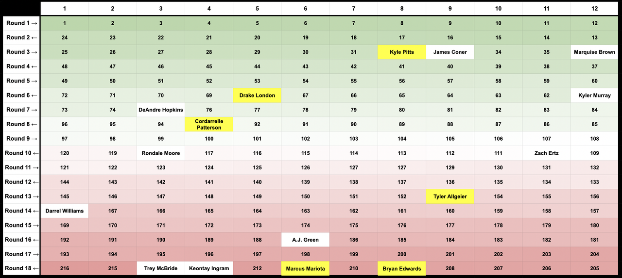 Favorite game stack: Kyler Murray (Round 5) + DeAndre Hopkins (Round 7) + Zach Ertz (Round 10) with Drake London (Round 6) and/or Bryan Edwards (Round 18).