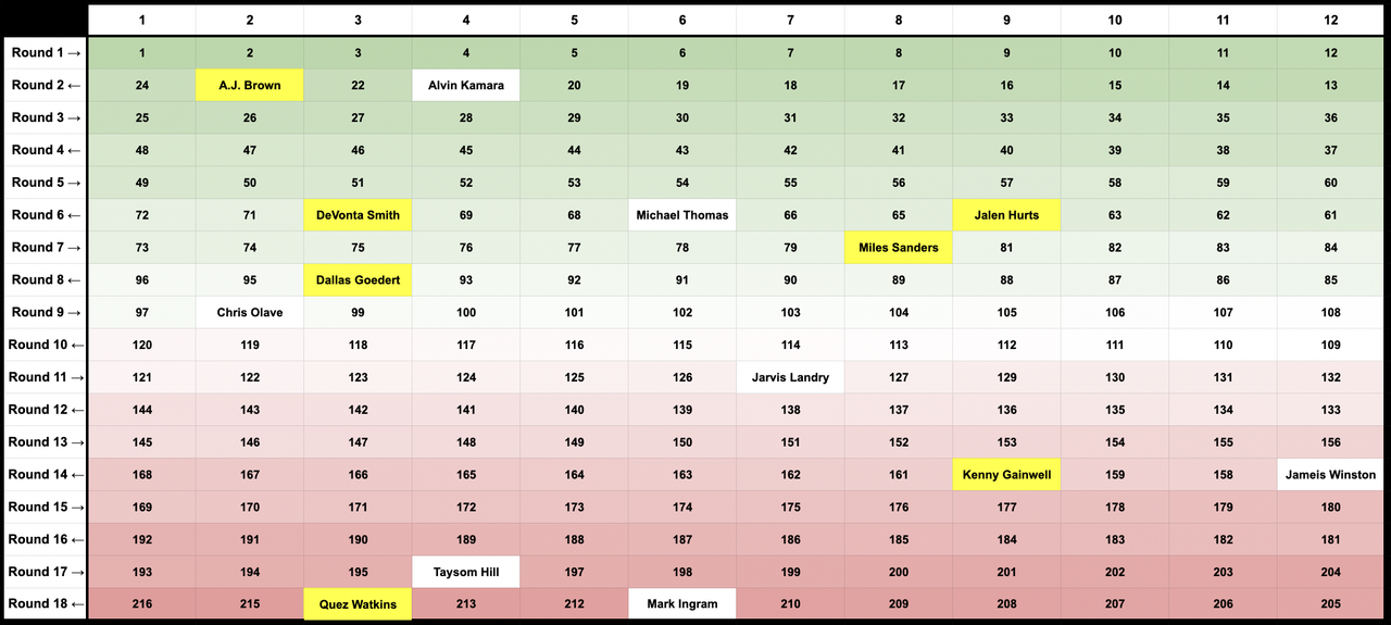 Favorite game stack: A.J. Brown (Round ⅔ turn) + Jalen Hurts (Round 6) + Dallas Goedert (Round 9) with Michael Thomas (Round 7).