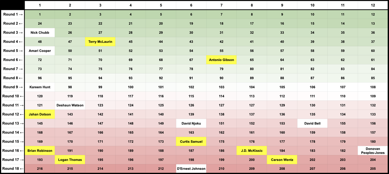 Stacking the Ravens is something we clearly want to do given their upside, but actually doing it properly takes some finesse. Mark Andrews in Round 2 is straightforward, but both Lamar Jackson (52.2 overall) and Rashod Bateman (56.0 overall) are Round 5 selections. To get the Lamar double stack, it’ll take Bateman falling all the way to Round 6 (unlikely but ideal) or slightly reaching on Lamar in Round 4 (very doable but less good). For this reason, Lamar and Andrews will be paired together far more often than Lamar and Bateman. Evening that out is smart. At the end of drafts, Devin Duvernay (Round 17/18 turn) is the best bet after starting in 3-WR sets last year, but there are Tylan Wallace and mini slot James Proche truthers in the deep interwebs of the internet. … Pittsburgh has plenty of skill-position talent scattered across the draft board to facilitate whatever bring back you’d like, but by the time Week 17 rolls around, Pickens will be in the Post-Bye Rookie Bump phase and he’s pretty cheap right now.