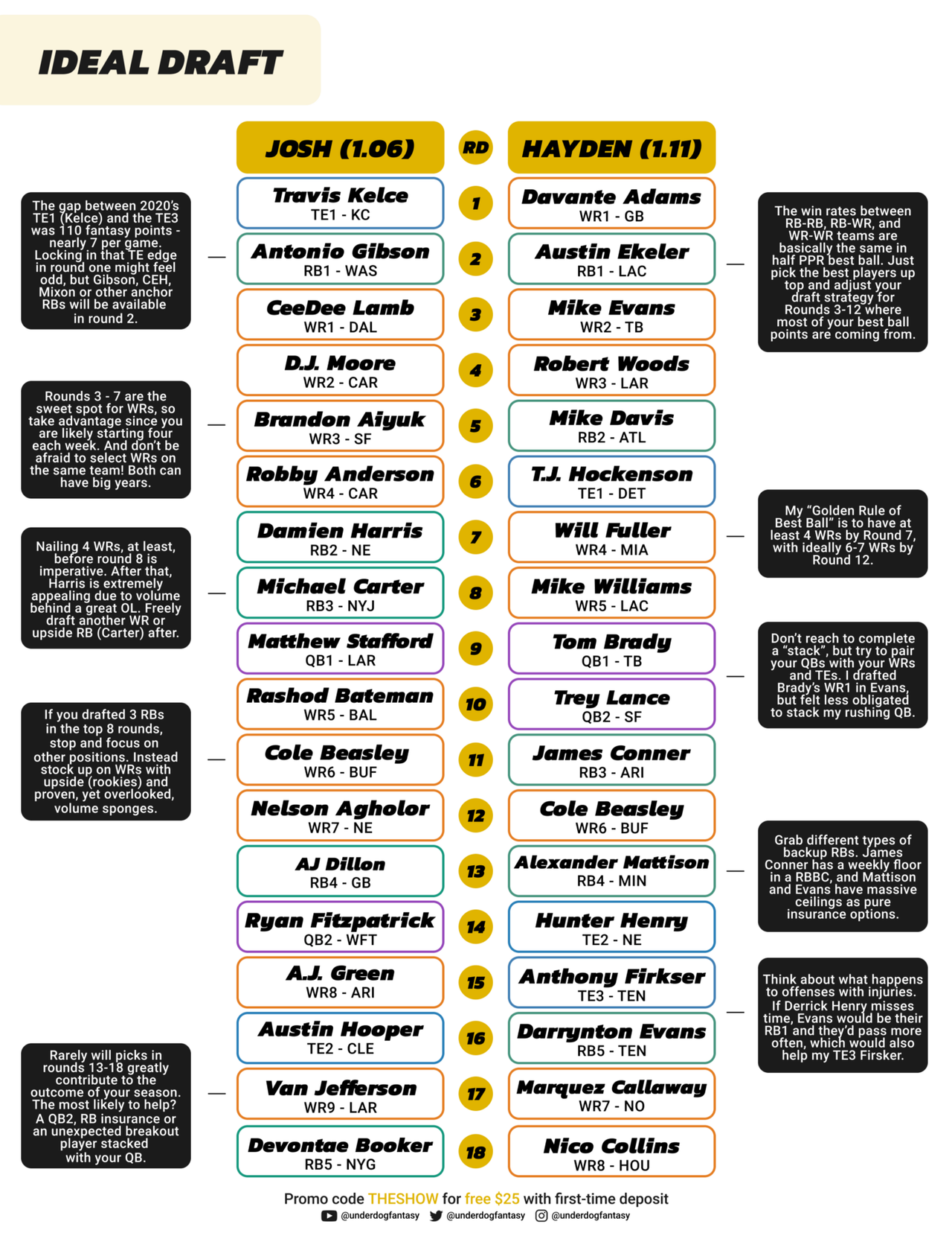 When it came to stacking, I found 3 ways to get it — Tom Brady and Mike Evans, Austin Ekeler and Mike Williams, and Anthony Firkser and Darrynton Evans. We all know that stacking a QB with a WR is smart, but there’s still some slightly positive correlation between the other positions on the same roster, too. Austin Ekeler and Mike Williams can both have a spiked week in the best ball playoffs if the Chargers are trailing going into halftime, especially if Keenan Allen were to miss time. Anthony Firkser and Darrynton Evans are massively correlated at the highest outcomes, when Derrick Henry misses time. A Big Dog injury would vault Evans into a 15+ touch role and would make the Titans more pass heavy in general, particularly in the red zone where Firkser could be maximized. When I’m doing non-QB stacks, I like to do them when they don’t involve high-end draft picks. For example, I drafted Austin Ekeler over Aaron Jones at the 2.14 here because Davante Adams’ ceiling outcomes are unlocked when Jones is out or not being a focal point of the offense.