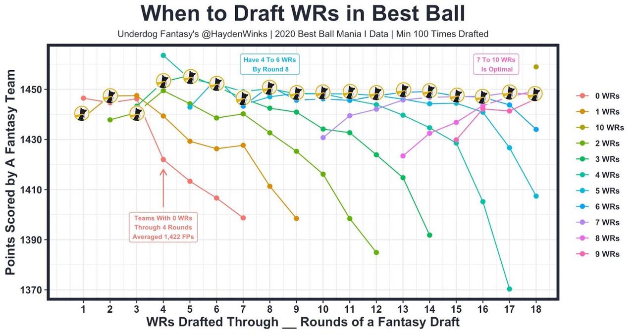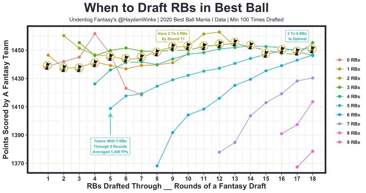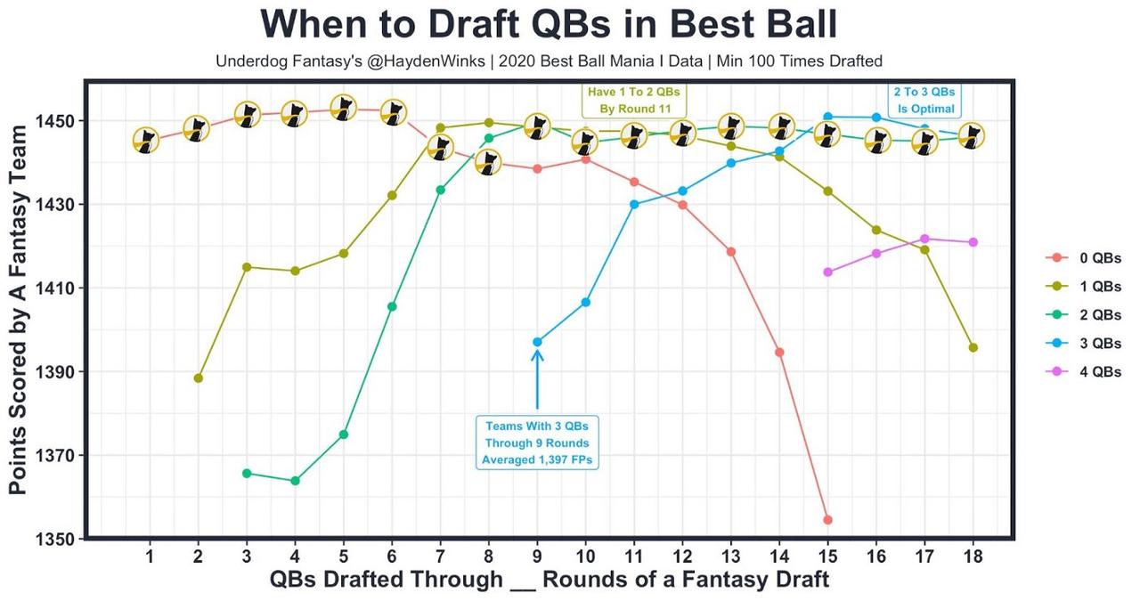 Based on last year’s Best Ball Mania data, my roster construction path was optimal at nearly every round. The chart above shows how many points teams averaged depending on how many QBs they had at each round of the draft. My roster construction path is highlighted by the very cute Underdog Fantasy logo. In general, we want 1–2 QBs by Round 11 and 2–3 QBs at the end of the draft.