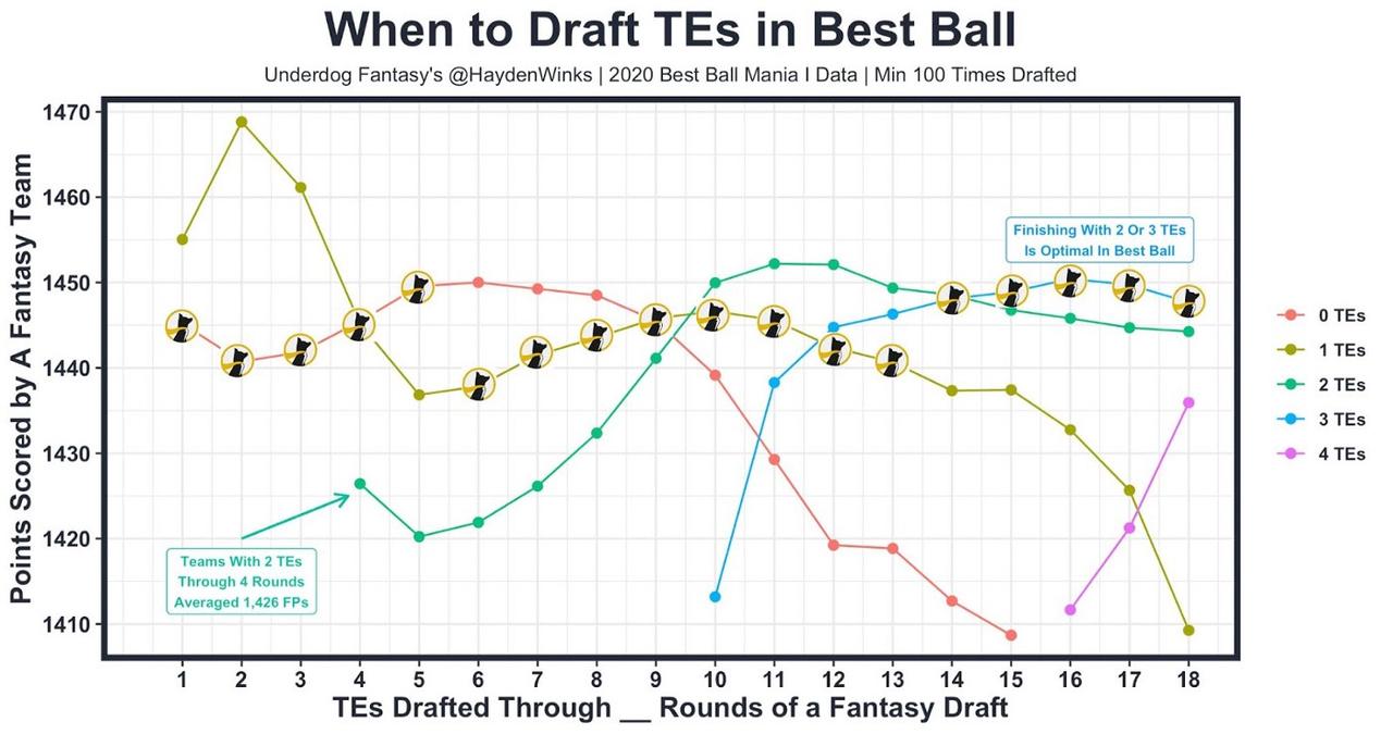 Please ignore the roller coaster ride of the early-round portion of this chart. A one-year sample of a onesie position is not worth chasing. With that said, I think last year’s data becomes more stable the further into the draft we go because that’s when more TEs were drafted. It was optimal to have 1–2 TEs at Round 11 and 2–3 TEs at the end of the draft. That’s the model I followed by anchoring Hockenson early and adding Henry/Firkser depth late. Hopefully these three TEs can ping pong their TD scoring on different weeks and that difference closes the gap on Kelce/Waller/Kittle teams.