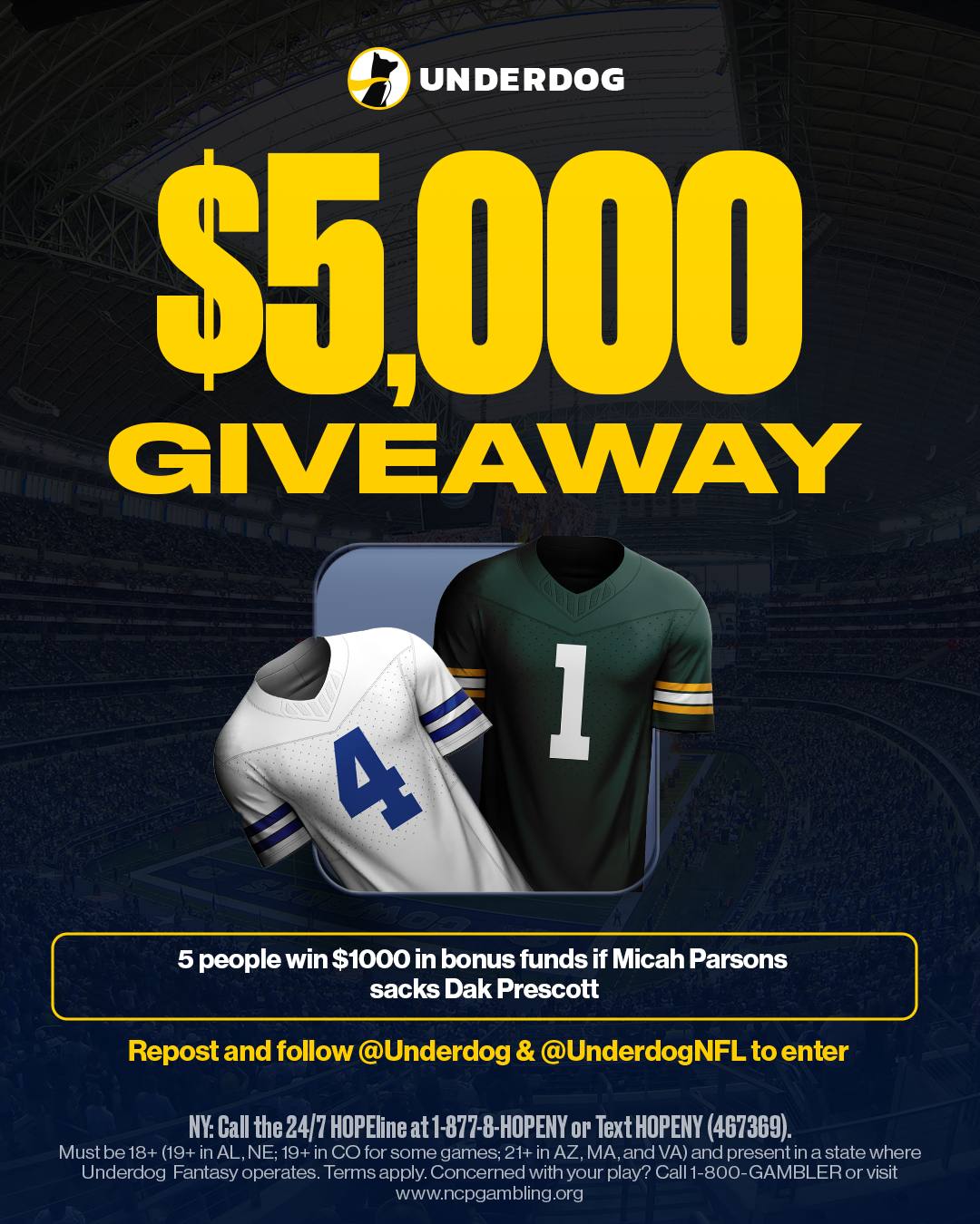 Underdog will award 5 winners $1,000.00 in bonus credits if Micah Parsons sacks Dak Prescott in the game between the Dallas Cowboys and Green Bay Packers on Sunday, September 28, 2025. Winners will be selected at random and will receive $1,000.00 in Underdog Fantasy bonus credit deposited to their Underdog account.