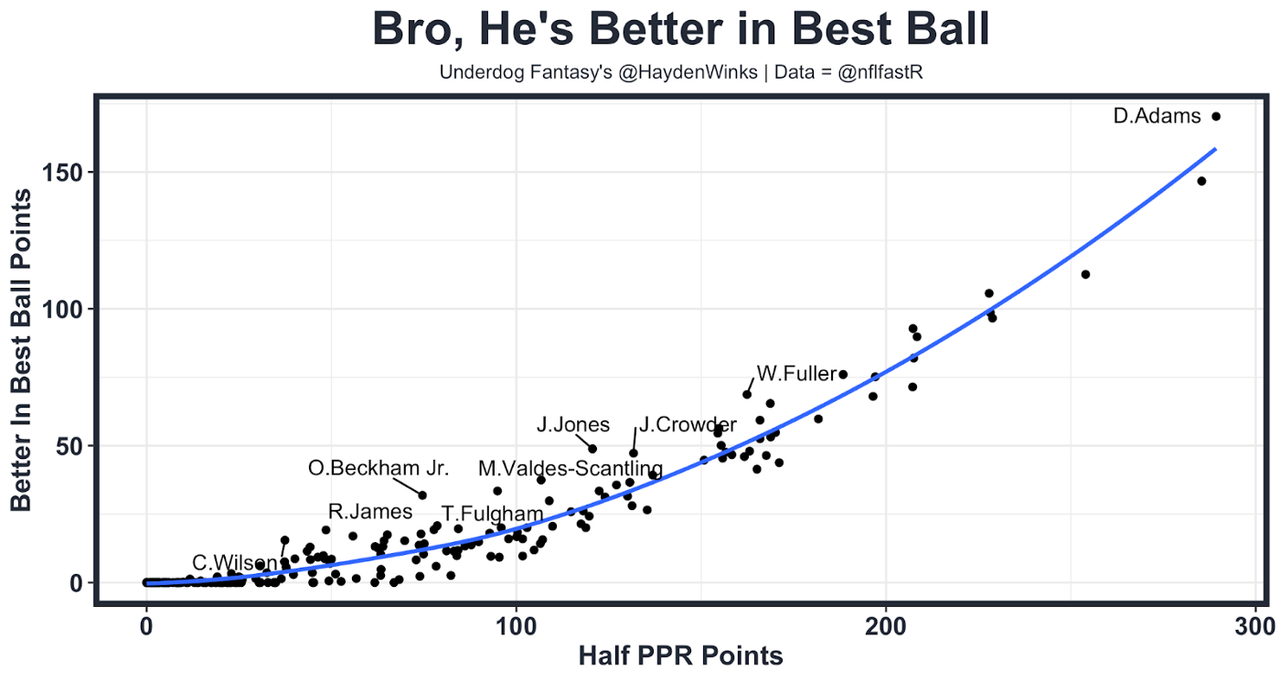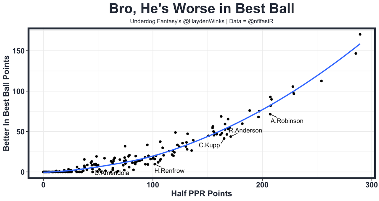 But instead of just saying “I like him better in best ball” because we’ve seen him score a 50-yard touchdown on Monday Night Football, I decided to be a total nerd and turn it into an actual metric: “Better In Best Ball Points”.