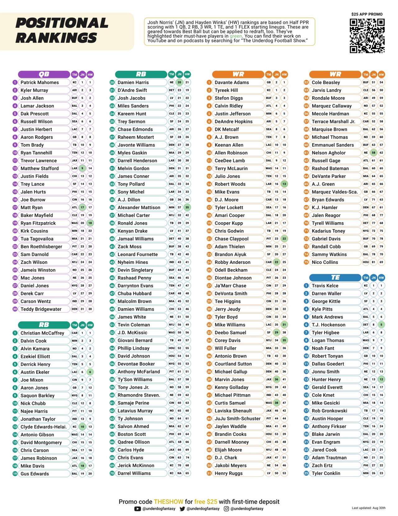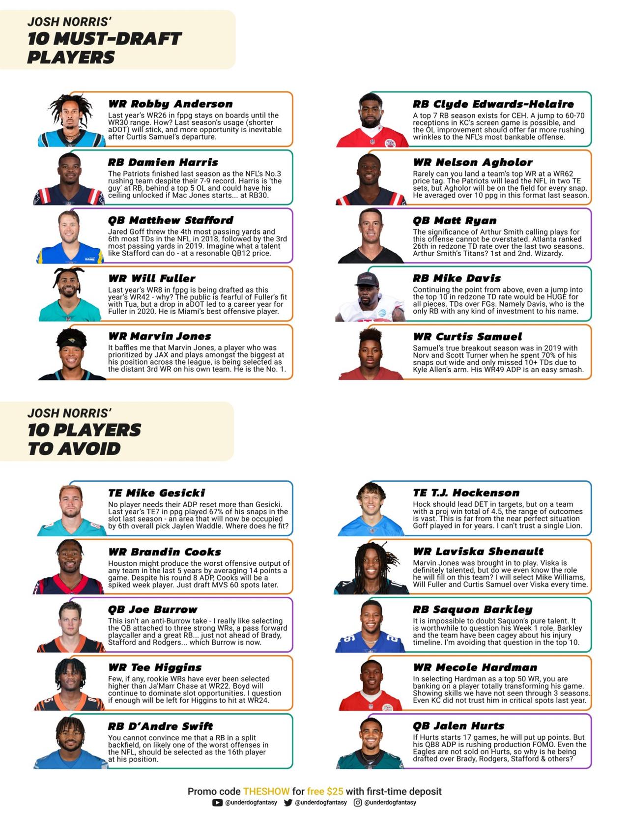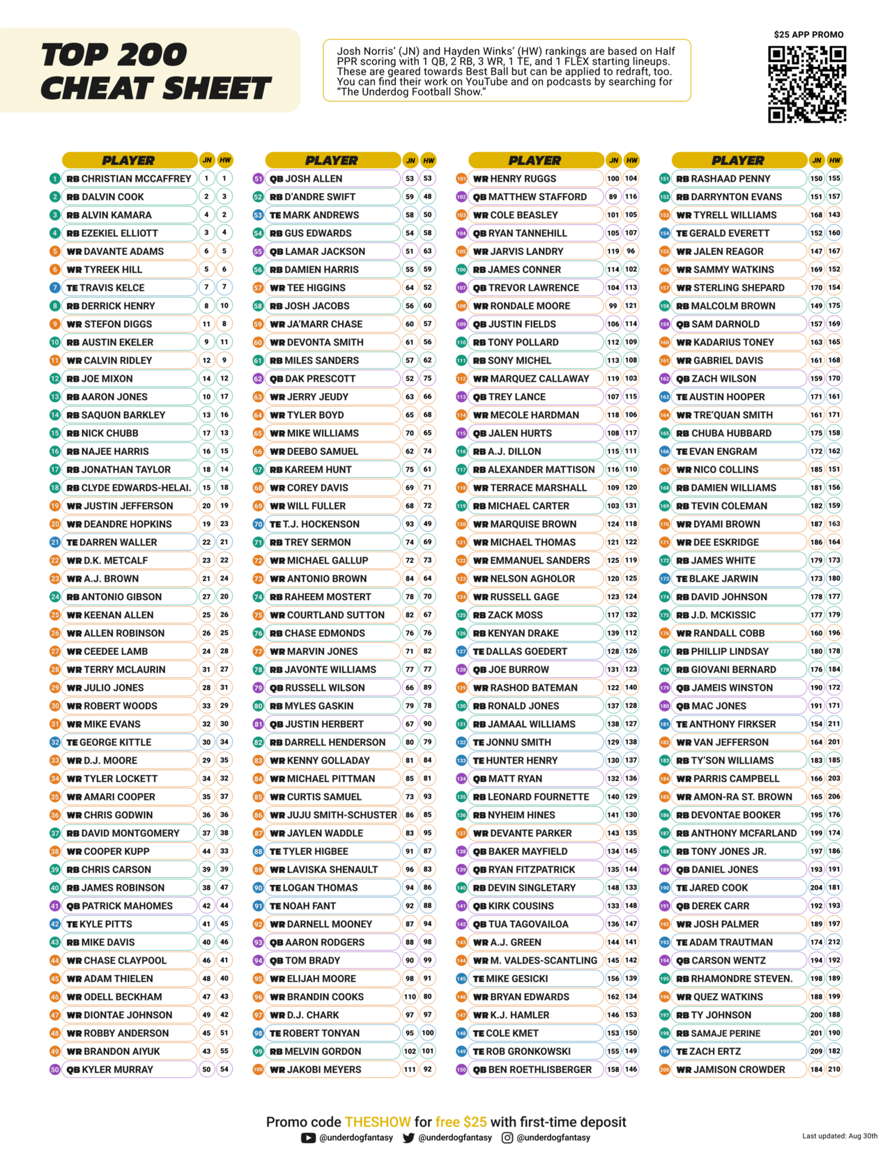 The Underdog Fantasy Draft Guide is available for download, and it’s easily printable in color (7 pages) for your in-person drafts. It includes top-200 overall rankings, positional rankings, must-draft players, players to avoid, ideal drafts, best ball tips, and more. Josh Norris and Hayden Winks will update the guide every couple of weeks as more news comes from training camp and preseason games. Make sure you stay tuned for updates by reading Underblog, subscribing to our YouTube Channel, and following The Underdog Football Show on your podcast platform.