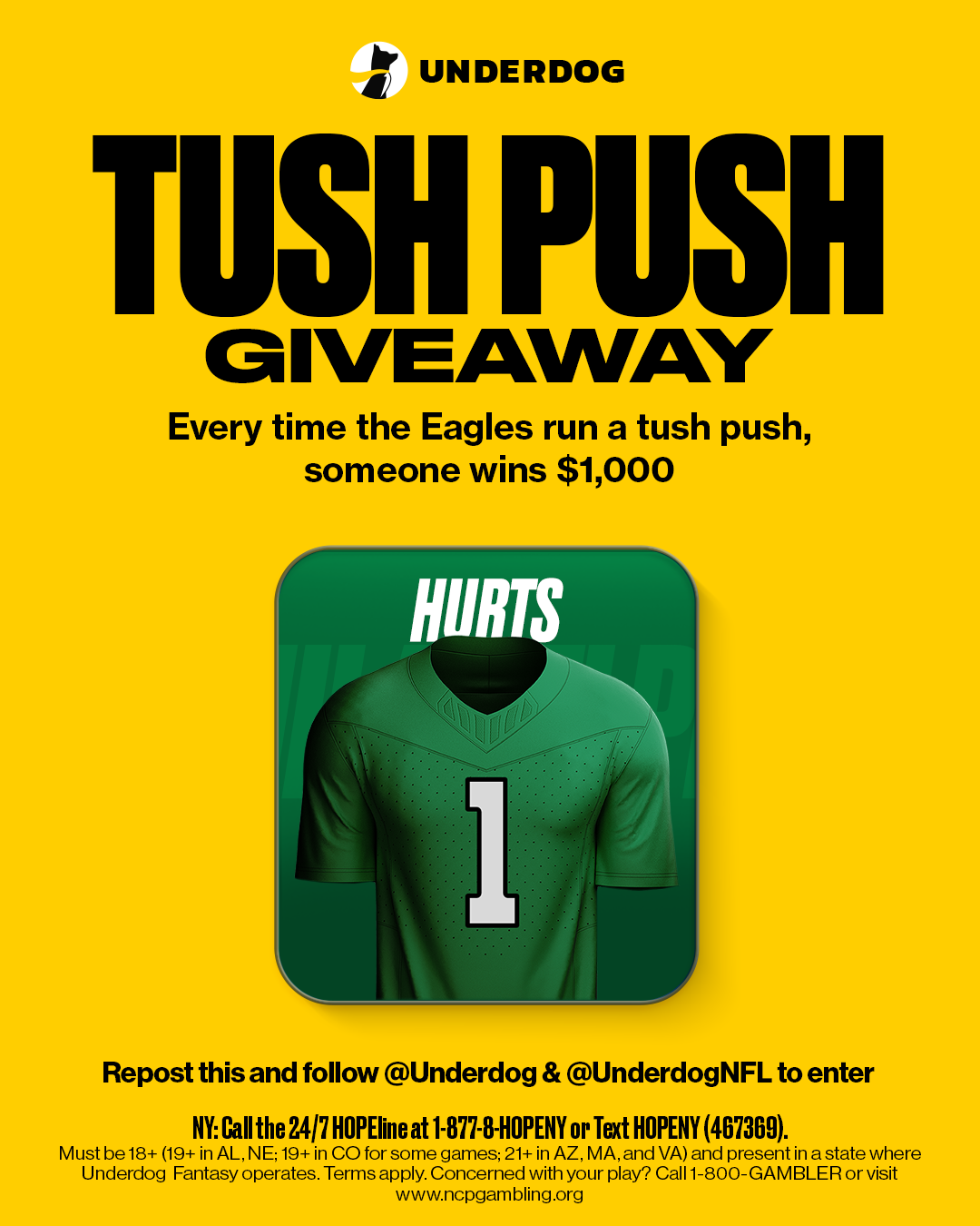 Underdog will award one customer $1,000.00 in bonus credits for every Tush Push run by the Eagles in the game between the Philadelphia Eagles and Green Bay Packers on Monday, November 10, 2025, up to a maximum of 5 winners. Winners will be selected at random and will receive $1,000.00 in Underdog Fantasy bonus credit deposited to their Underdog account.
