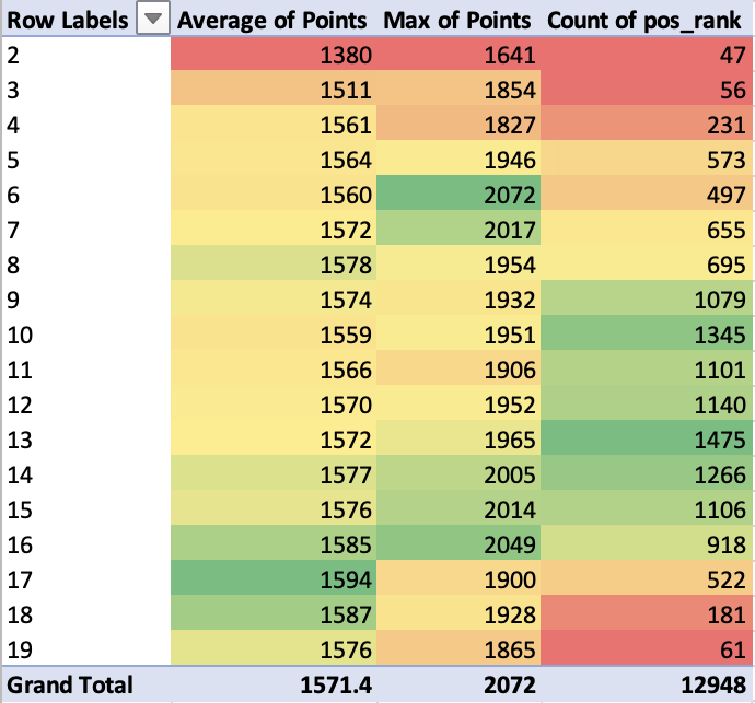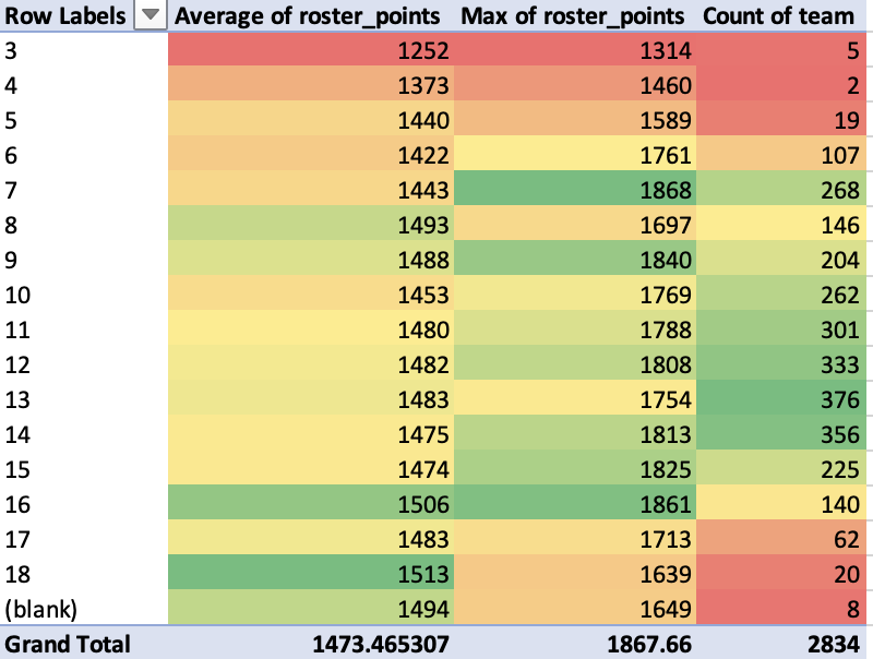 There are two caveats, however. Based on the content I’ve listened to, I’d argue that the drafters who were pushing the limits on their QB2 being so late in the draft are just smarter drafters in general. It’s not common sense to be so drastic in structure, so there could be a sample issue somewhat skewing the results towards later QB2s. I don’t think this impacts it all that much, but it’s possibly adding a few points on average.