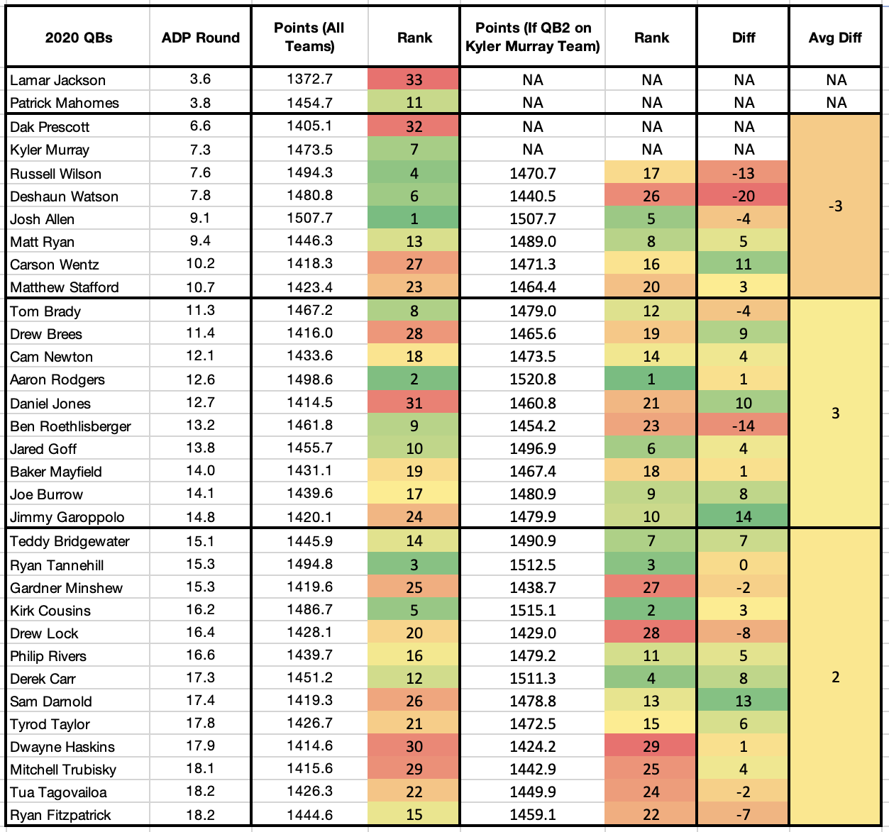 In both years, teams who drafted a quarterback in the Round 6-10 range averaged 12 or so more points than teams who drafted a quarterback in the Round 15-18 range. Despite this, the 2021 Josh Allen and 2020 Kyler Murray teams still averaged more points when the QB2 was drafted in the late-round range. This is reasonable evidence that there is cannibalization within two early-round quarterbacks when at least one of the quarterbacks are a league-winner like 2021 Josh Allen or 2020 Kyler Murray.
