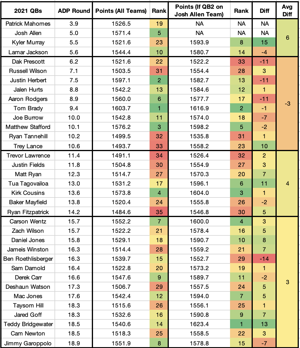 These “ranks” are how many points a team averaged if they had that quarterback, with the second rank column being how many points a team averaged if they had that quarterback as the QB2 on a Josh Allen team. The difference in the ranking shows if a quarterback was relatively better than the other quarterbacks with or without Josh Allen on the team. I’ll explain.