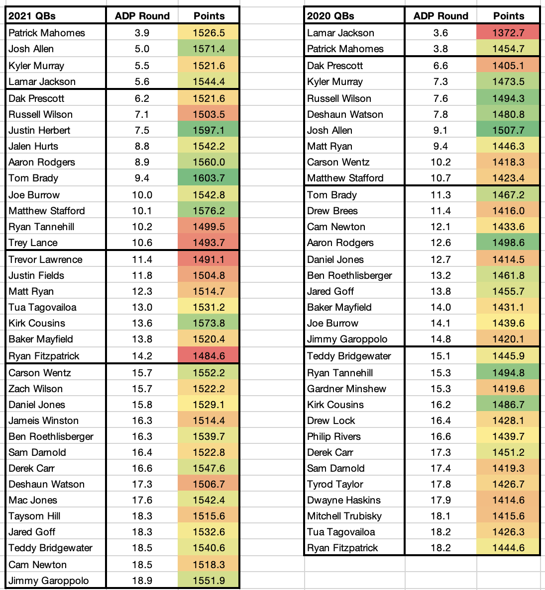 Sample: 2021 Josh Allen teams and 2020 Kyler Murray teams because they finished QB1 and QB2 overall in their respective seasons as 48th (QB2 in ADP) and 72nd overall (QB4 in ADP) picks. If you nail an early-round quarterback, this is the type of season we are talking about.