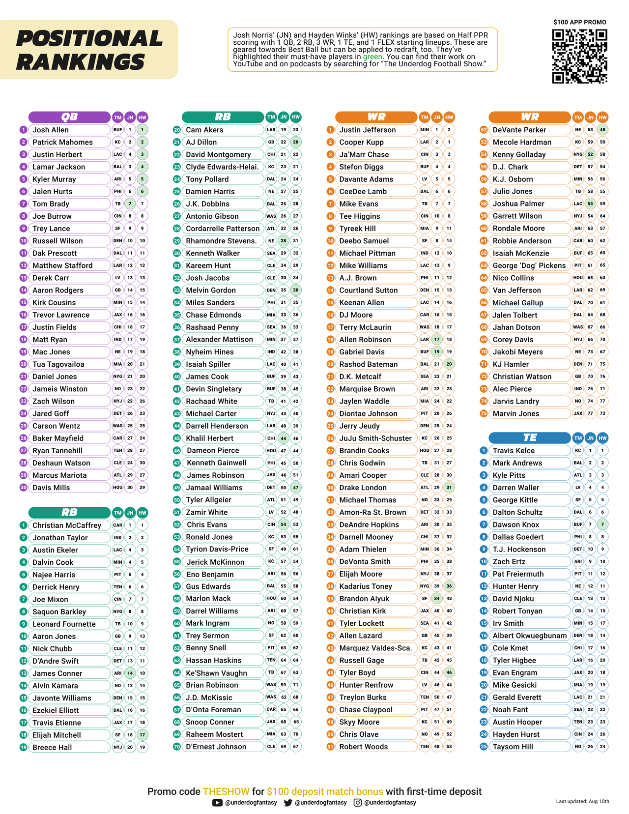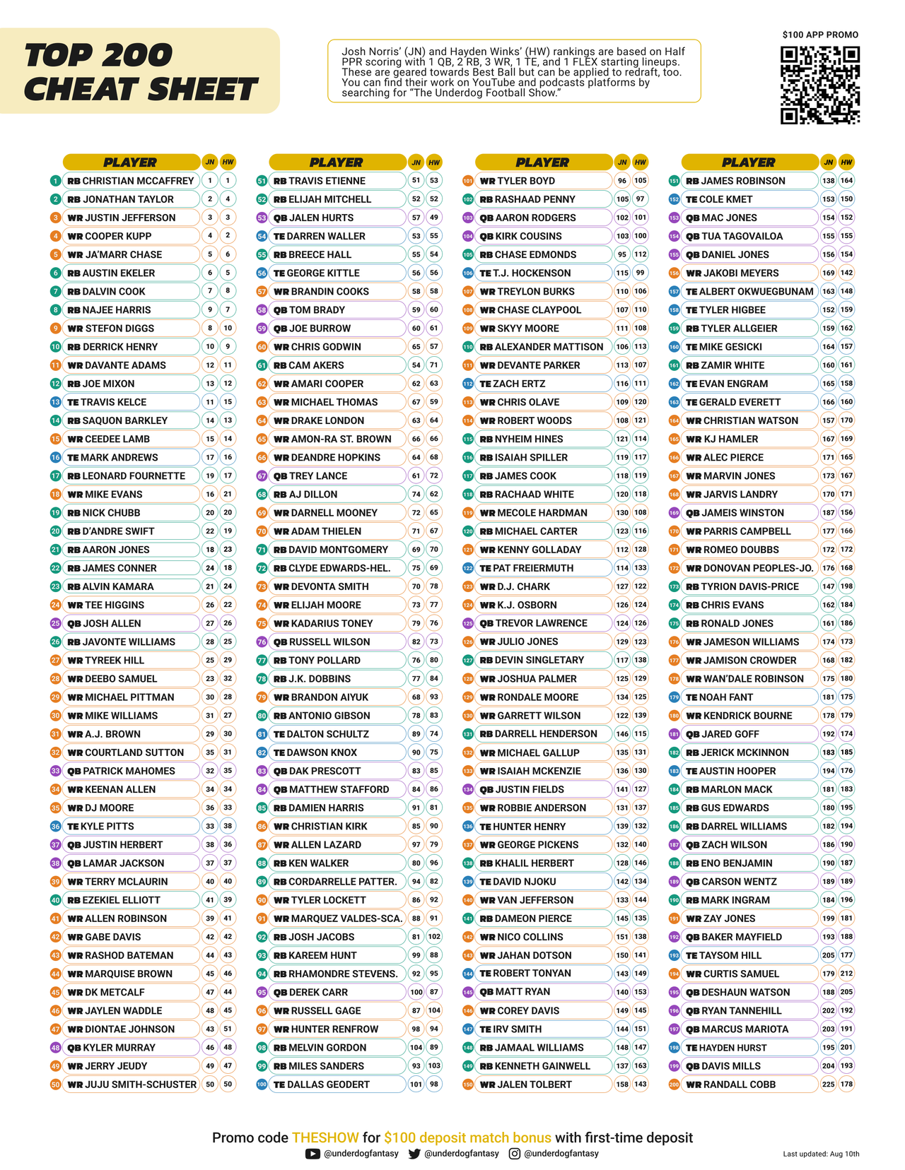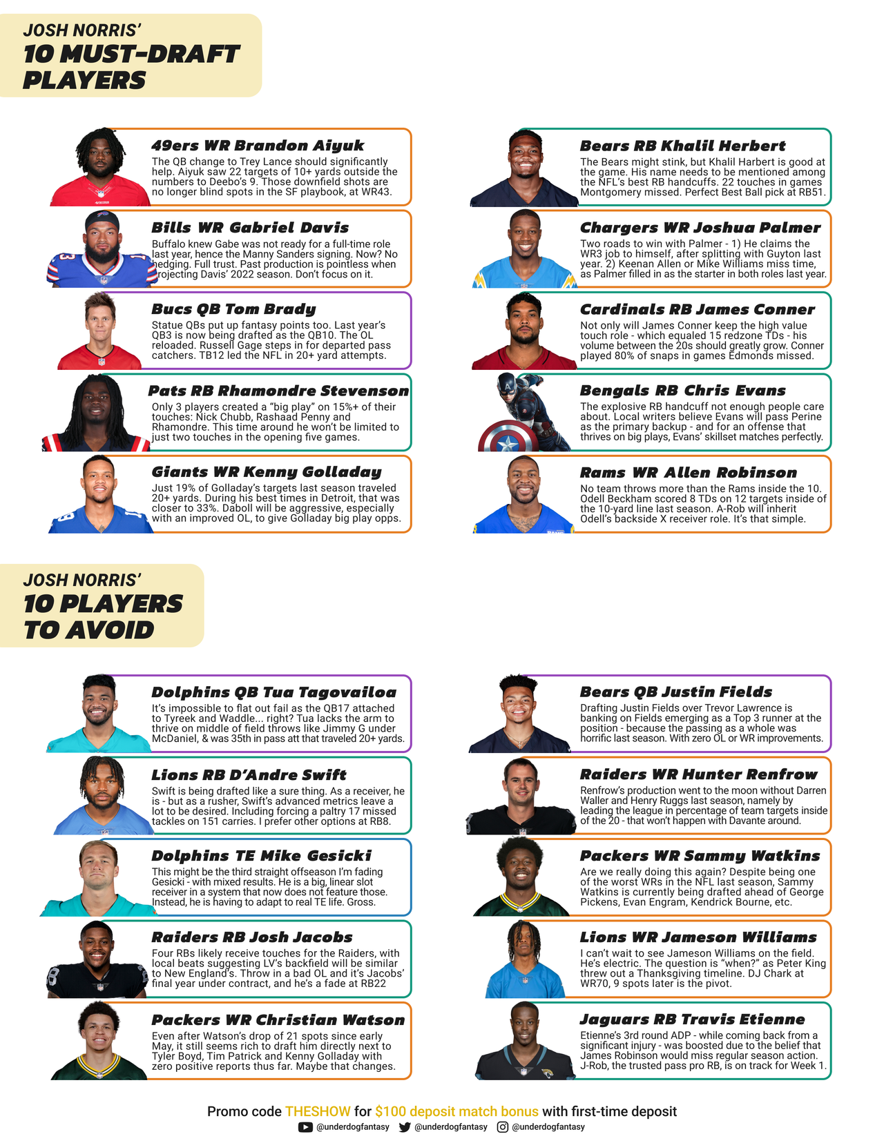 The Underdog Football Show's FREE printable draft guide is here. Josh Norris and Hayden Winks will update their fantasy football rankings, target players, busts, and ideal drafts throughout August and early September as they grind the news and preseason tape. Their last update was on August 10th. Enjoy!