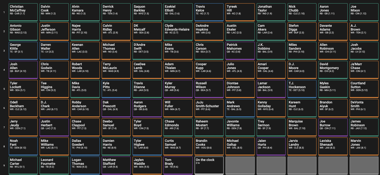 Instead of getting stuck with a hard-fast rule within the first six rounds, I pivoted to 4 WRs through Round 7 so I can stay relatively flexible while also following historical win rates. I want to be able to take advantage of when a non-WR slides way beyond his ADP, and this allows me to do so.