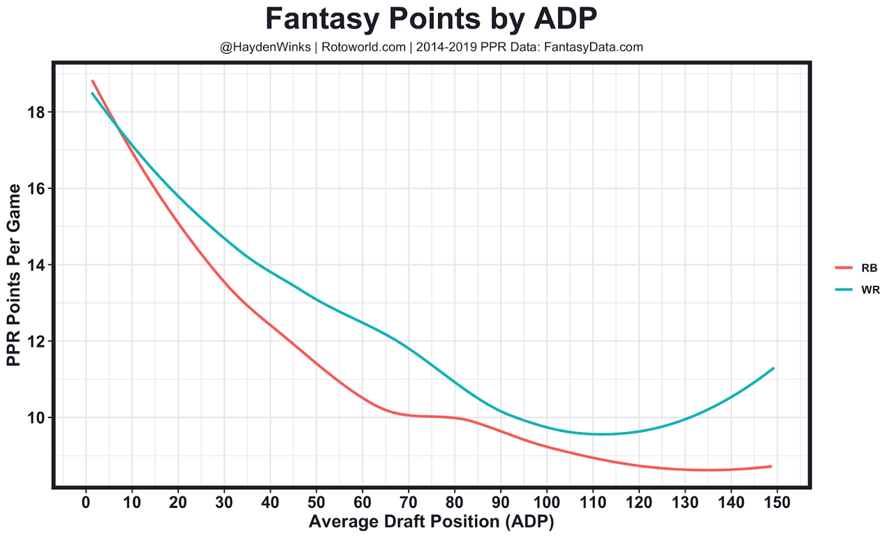 From a big picture perspective, it’s necessary to know how the two primary fantasy positions perform (in relation to each other) based on where they’re drafted. The chart above clearly shows that the gap between WRs and RBs is widest in favor of WRs in this 30th to 80th overall range, also known as the “RB Dead Zone”. On the flip side, RBs look more appealing in the first 15 overall picks and towards the 100th overall pick.