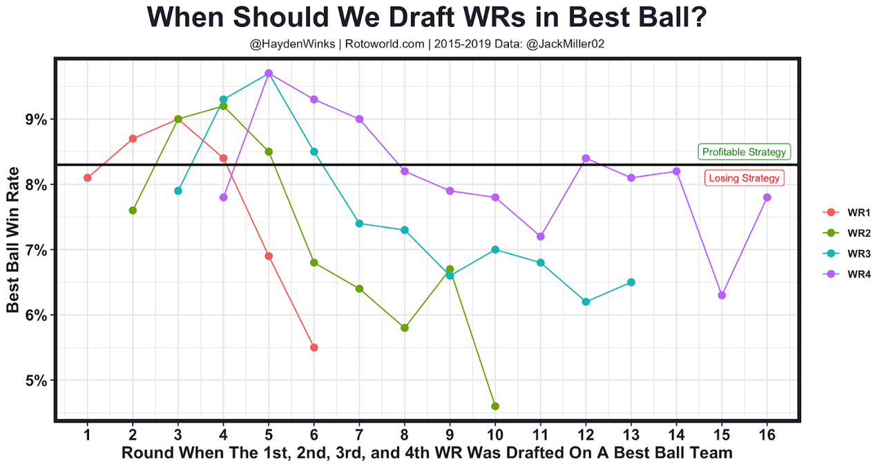 I am very rarely drafting a QB or my RB3 by Round 7. Instead, I’m finding one or two anchor RBs at the top of drafts, getting a top-six TE, and hammering WRs all throughout the early-to-middle rounds. It’s a strategy that always passes the eye test at any point in the draft, and the raw win rates certainly back up the strategy. This from Jack Miller: