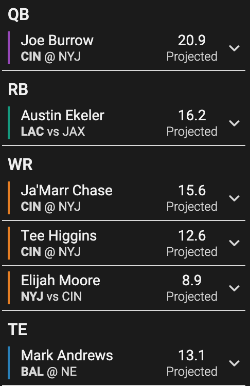 Joe Burrow (32.9 ADP): His matchup is great, and he'll be drafted only 40-70% of the time because he's the QB5 in default rankings. Obviously stack him with Ja'Marr Chase (6.5 ADP) and/or Tee Higgins (29.1 ADP), though double stacks are encouraged here. ... Bring back options: Garrett Wilson (34.9 ADP) and Elijah Moore (35.9 ADP).