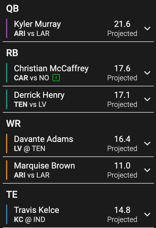 Derek Carr (35.8 ADP): The target tree goes from 3 to 2 with Hunter Renfrow out, so Davante Adams (7.7 ADP) and Darren Waller (23.9 ADP)) both project better. Plus, the matchup is great due to injuries. ... Bring back options: Derrick Henry (21.0).