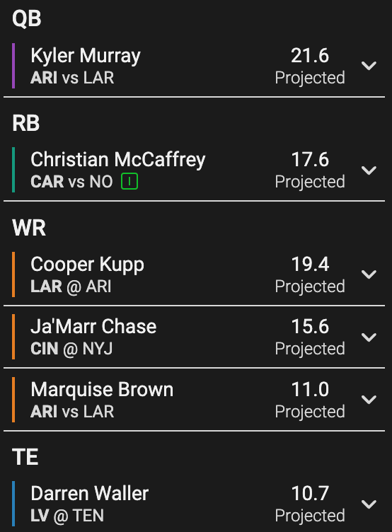 Kyler Murray (34.1 ADP): The Rams are banged up in the secondary, and the neutral pace in this game is elite. He has two primary stacking options, Marquise Brown (35.5 ADP) and Zach Ertz (34.0 ADP), especially if the questionable James Conner (36.0 ADP) can't suit up. With all three of these players going undrafted more times than not, this is an all-too-obvious team to be overweight on. Make it happen. ... Bring back options: Cooper Kupp (1.4 ADP), Tyler Higbee (34.6), and Allen Robinson (35.9 ADP).