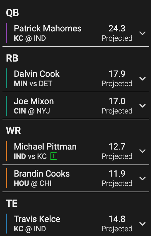 Patrick Mahomes (14.6 ADP): Best paired with Travis Kelce (5.9 ADP), Mahomes is probably worth double stacking here with JuJu Smith-Schuster (35.4 ADP) and Marquez Valdes-Scantling (35.9) rarely being drafted. The matchup is elite in general. ... Bring back options: Jonathan Taylor (7.4 ADP) and Michael Pittman (30.9 ADP), who is an excellent play after being underdrafted early in the week due to a questionable tag. He's since been taken off the injury report. Get some Mahomes + Pittman stacks.