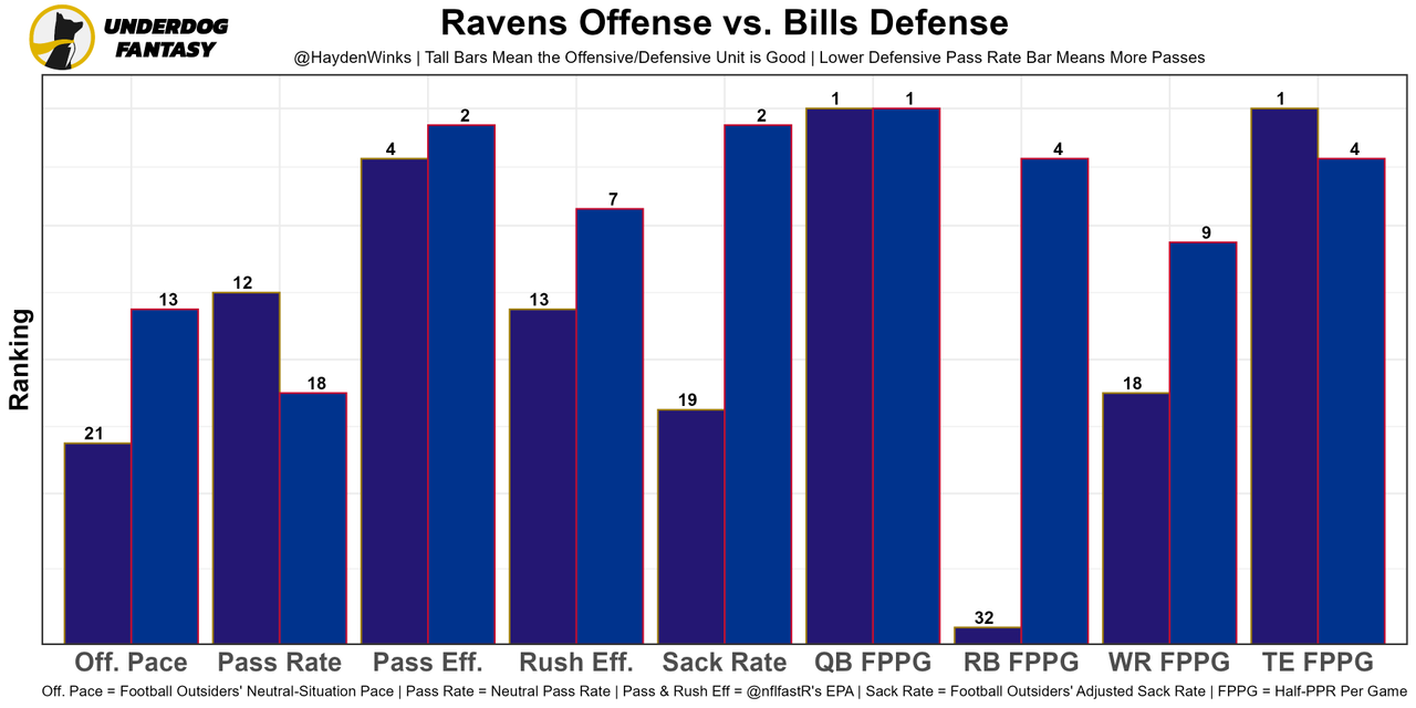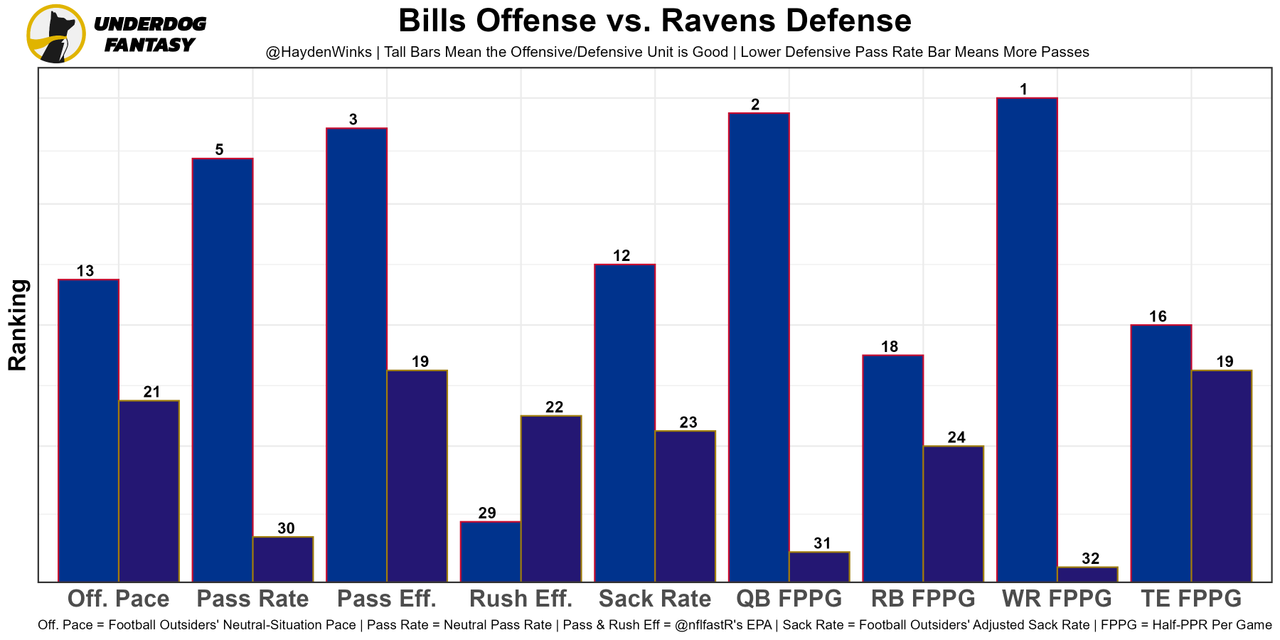The No. 2 fantasy QB faces the No. 31 defense against fantasy QBs. Seems good. Matchup-wise, the Ravens are man-heavy which could give Isaiah McKenzie some reps over Jamison Crowder in the slot, but Stefon Diggs is the primary man beater. Expect Gabe Davis and Dawson Knox to play better a week removed from their Week 2 injuries, especially with this game not being played on a 110-degree football field this week.