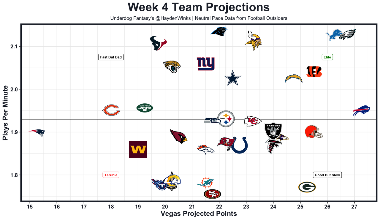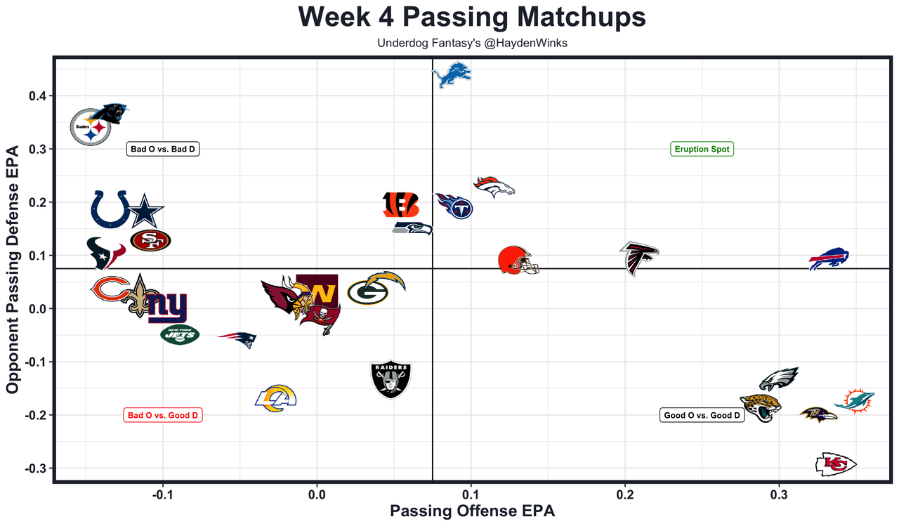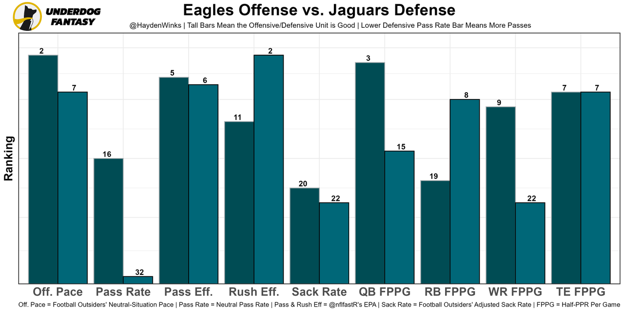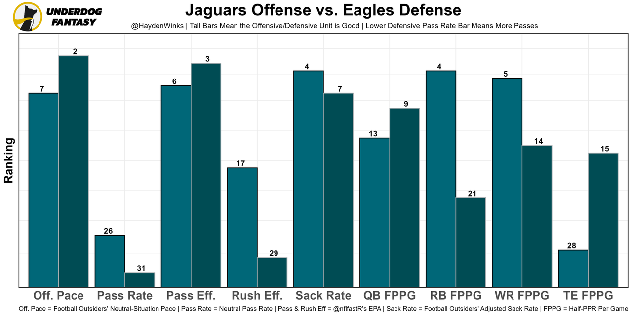 The scheme is putting all of their role players into positions where they succeed, and Lawrence has taken a second-year leap. Jacksonville is well-protected, too, ranking 1st in sack rate on offense. This is the toughest matchup to date, by far, but the Eagles offense has been so good that this could just turn into a fast-paced shootout. Both offenses are top-7 in neutral pace.