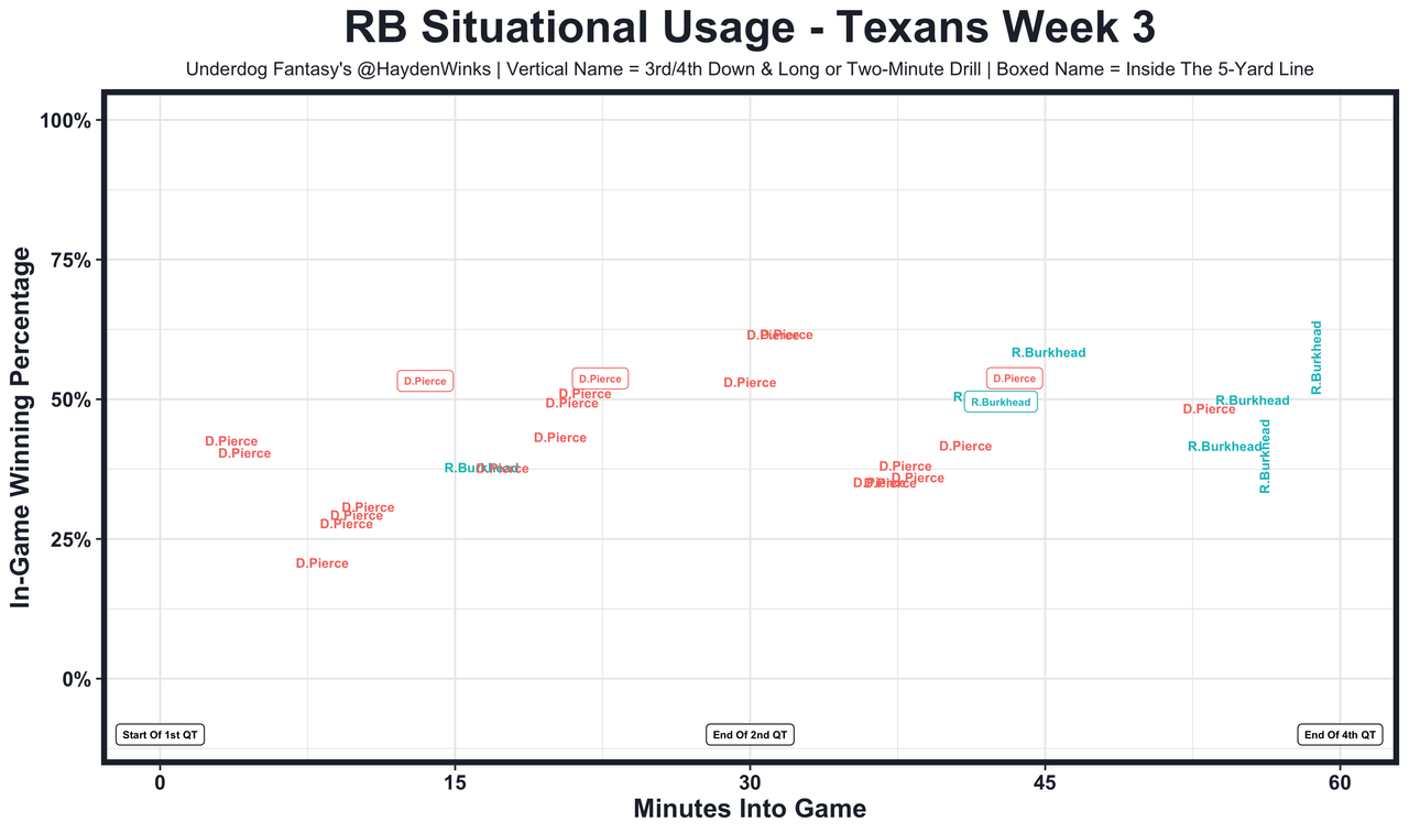 Dameon Pierce - He fumbled twice last week, including one late in the game. Pierce didn't play the rest of the game, though most of it came during the 2-minute drill which typically belongs to Rex Burkhead. There's a slightly lower floor here just in case their is a rookie benching. I put those odds low, but they do exist.
