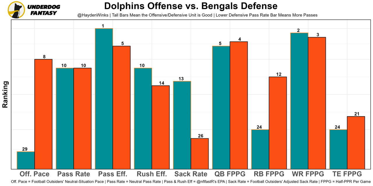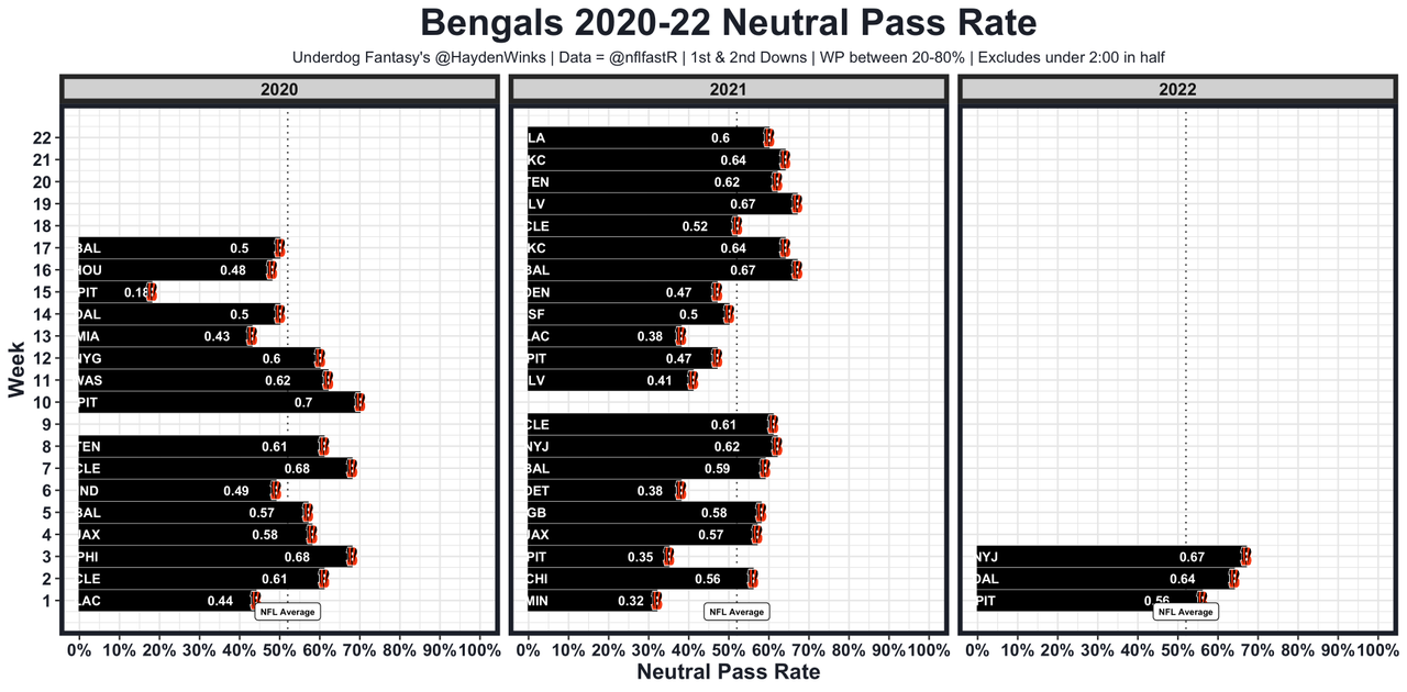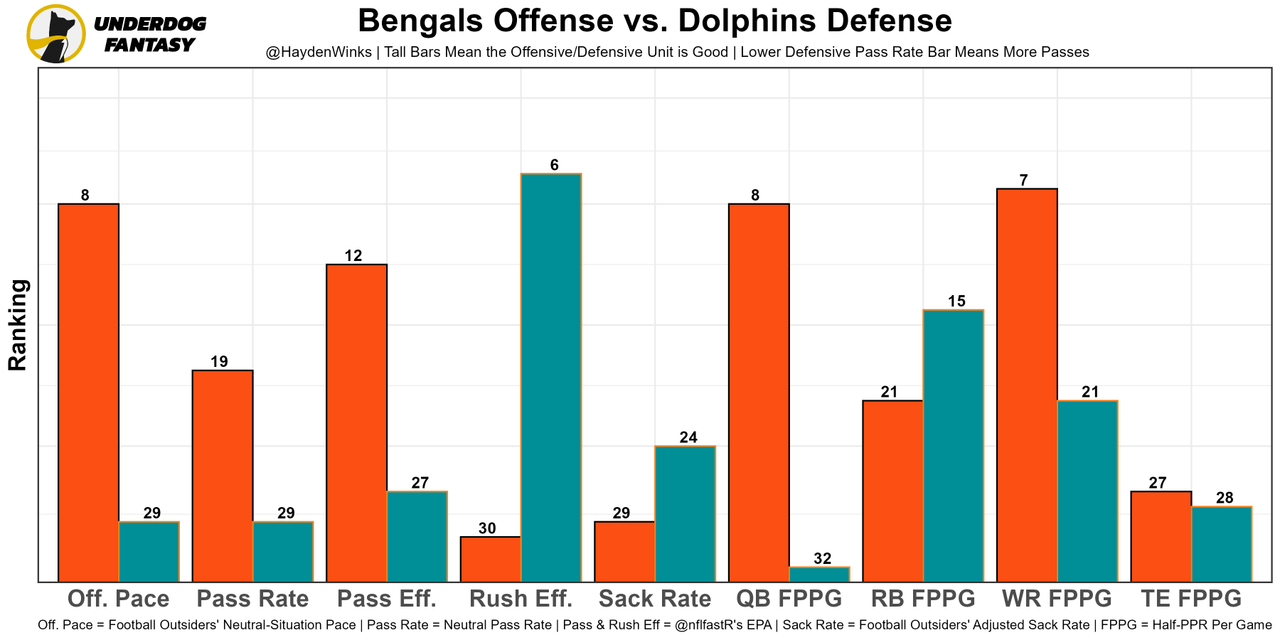 Last week against a single-high based defense, the Bengals had their highest neutral pass rate game since Week 10 of 2020. That's encouraging. Miami will blitz and play man defense most likely, which plays into the strengths of Cincinnatti's offense. I like this matchup. So does Vegas. The Bengals are 4th in implied points this week.